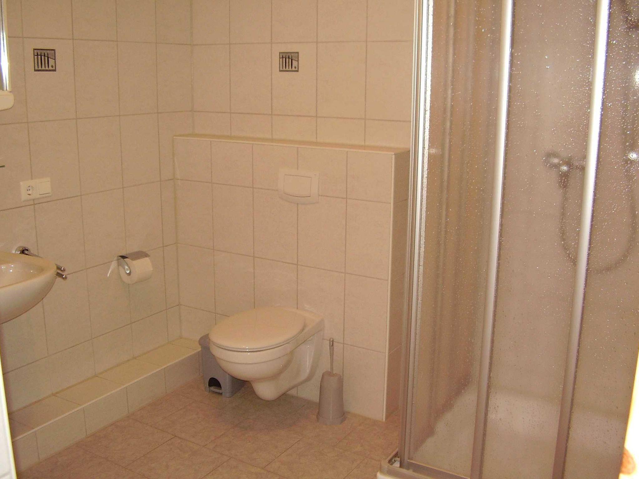 Modernes geräumiges Badezimmer mit Dusche und WC.