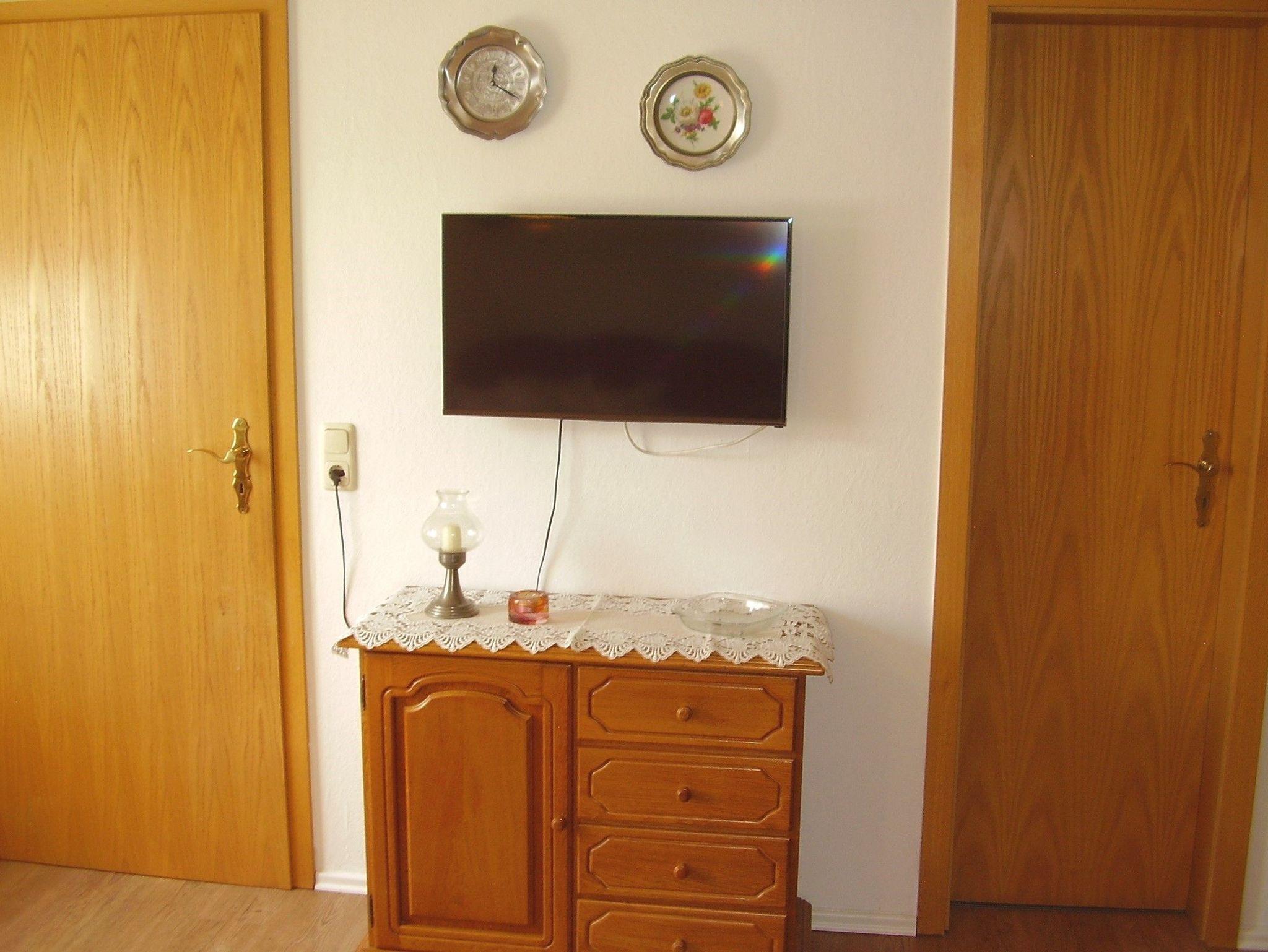 Offener Wohn-/Essbereich mit gemütlicher Sitzgruppe mit Ostfriesensofa und Flachbild-TV. Einbauküche mit 4-Plattenherd mit Backofen, Kühlschrank mit Gefrierfach, ausreichend Töpfen, Pfannen, Bestecke und Geschirr, etc..
