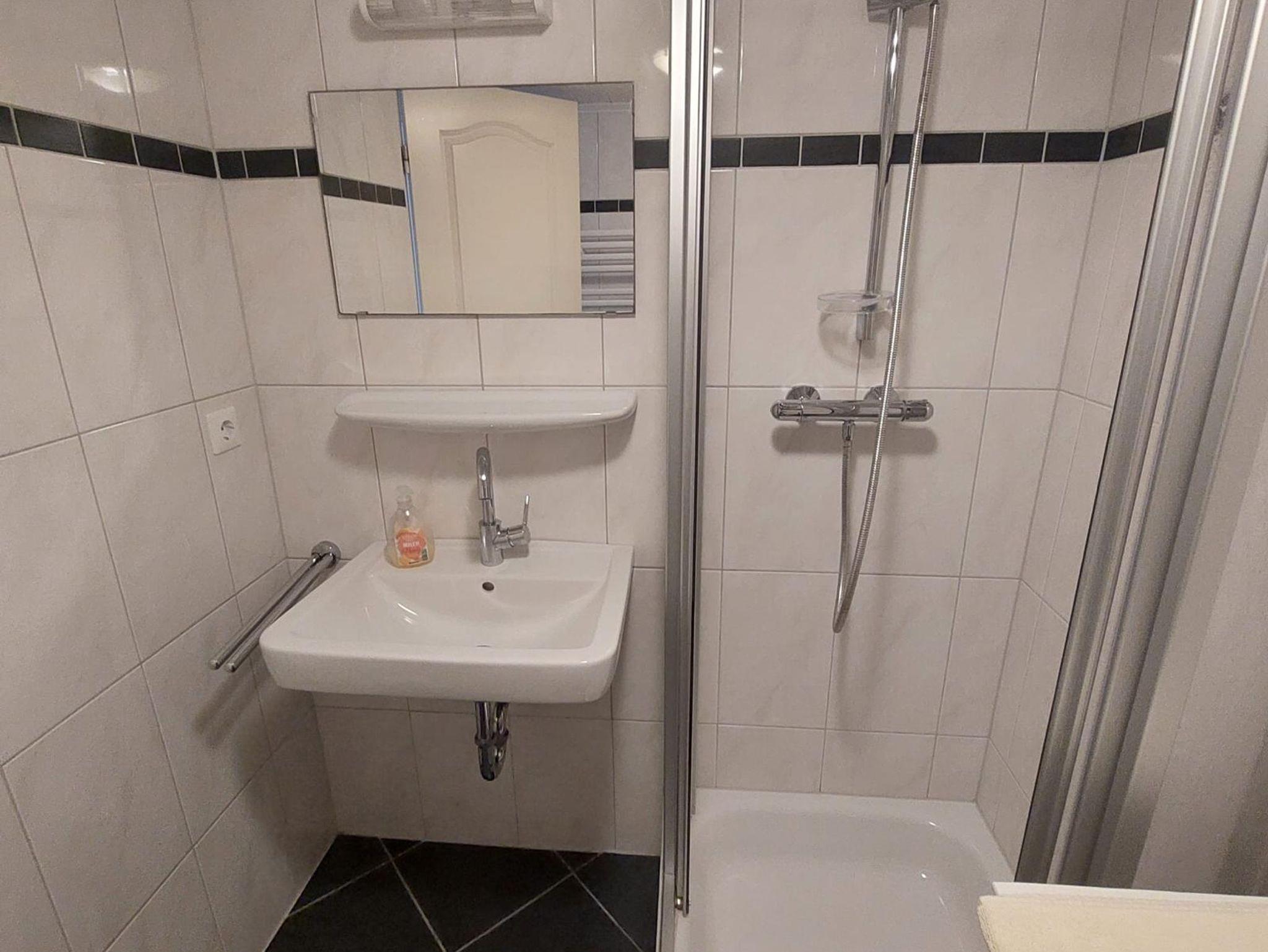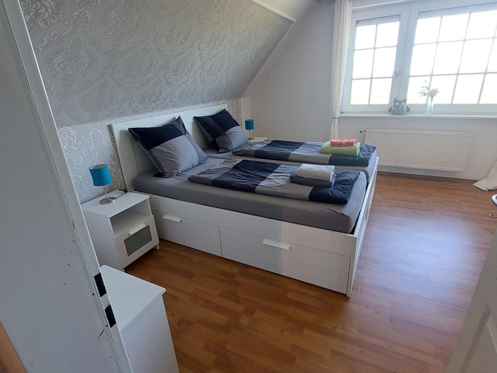 Auf einer Wohnfläche von ca. 55 m² werden Sie in unserer Ferienwohnung im Obergeschoss einen kombinierten Wohn-/Essbereich mit Sat-TV, eine integrierte Küchenzeile mit Vierplattenherd und Backofen, Kühlschrank mit Gefrierkombination sowie eine Mikrowelle und div. elektrischen Geräte vorfinden. Zwei Schlafräume sind mit jeweils einem Doppelbett ausgestattet und Ihre Betten sind bereits bei Anreise bezogen. Das Bad verfügt über Dusche/WC.