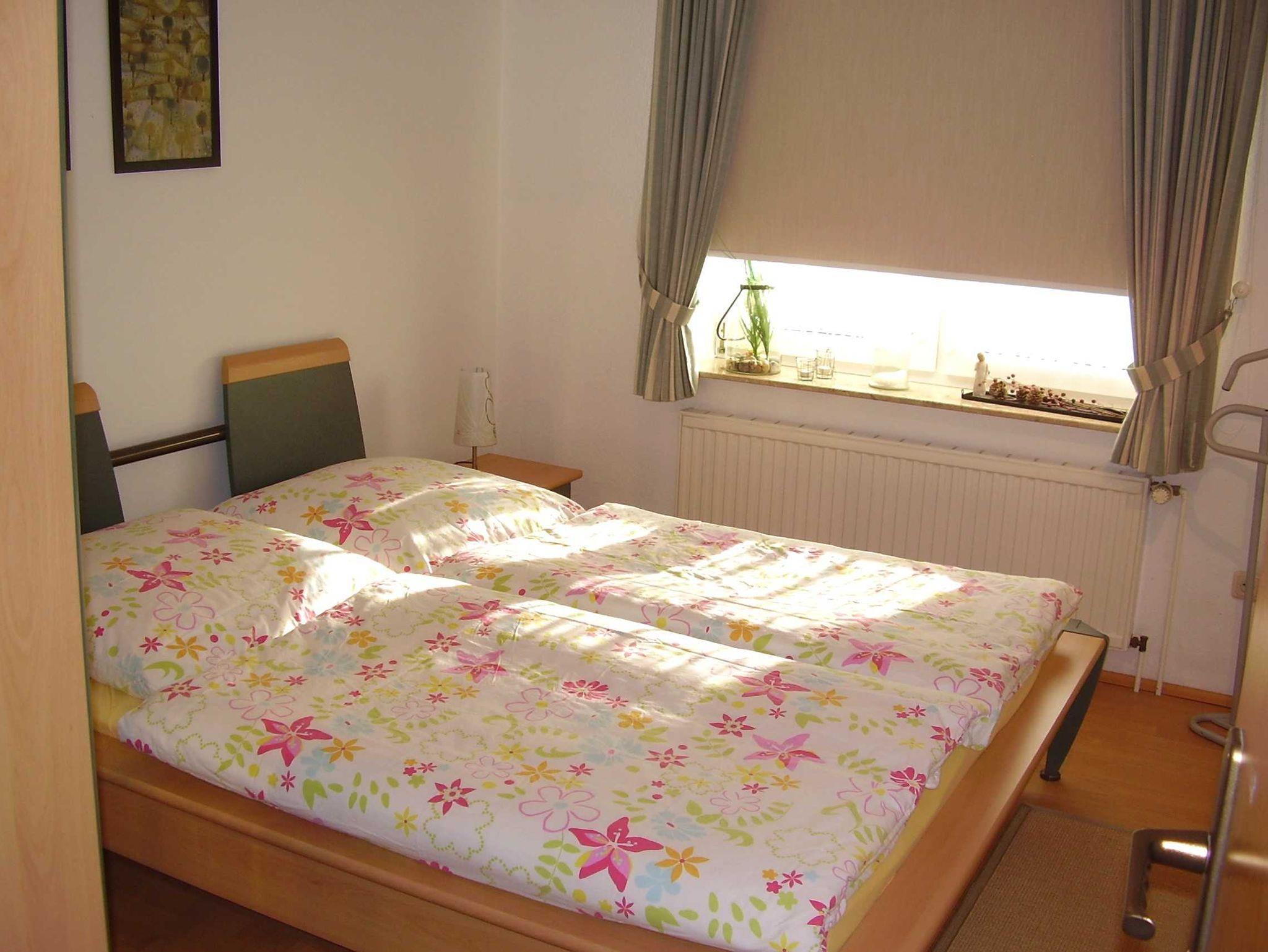 Ein Schlafzimmer mit Doppelbett. Babyreisebett muss bei Bedarf mitgebracht werden.