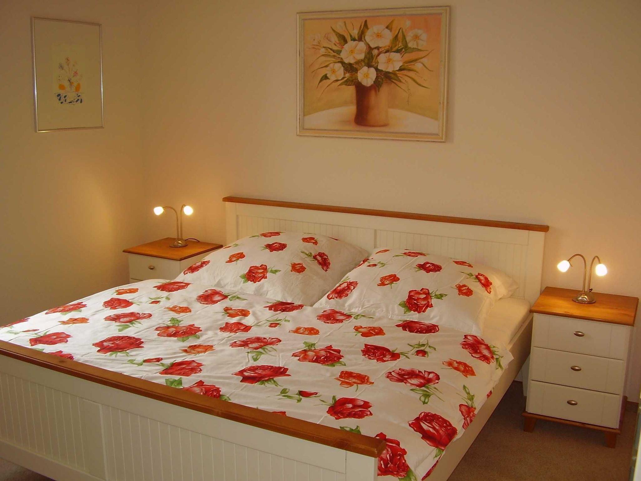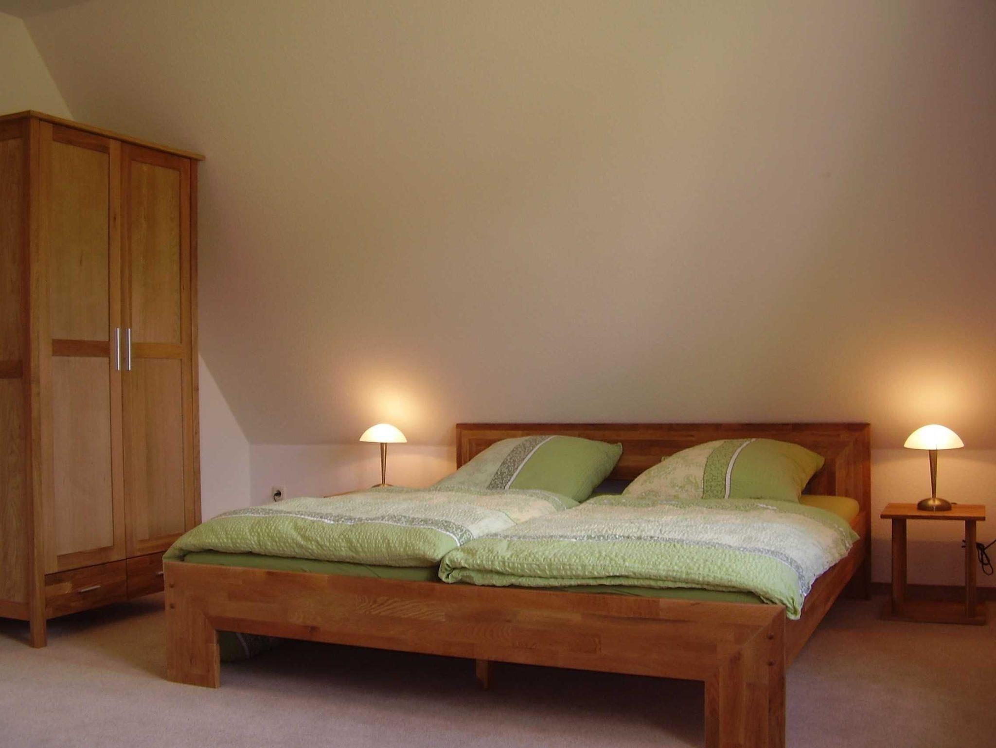 Ein Schlafzimmer mit Doppelbett.