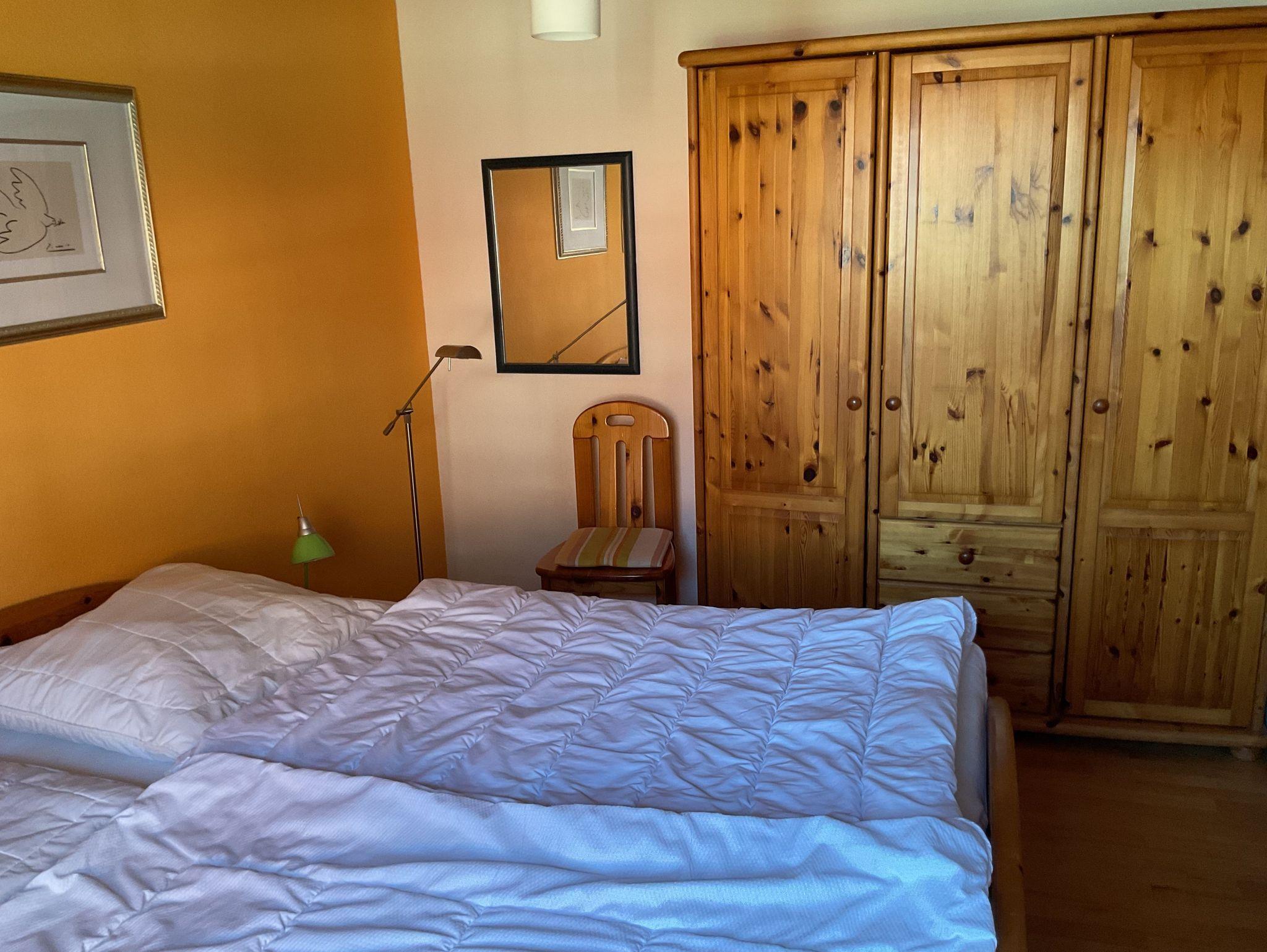 Ein Schlafzimmer mit Doppelbett.