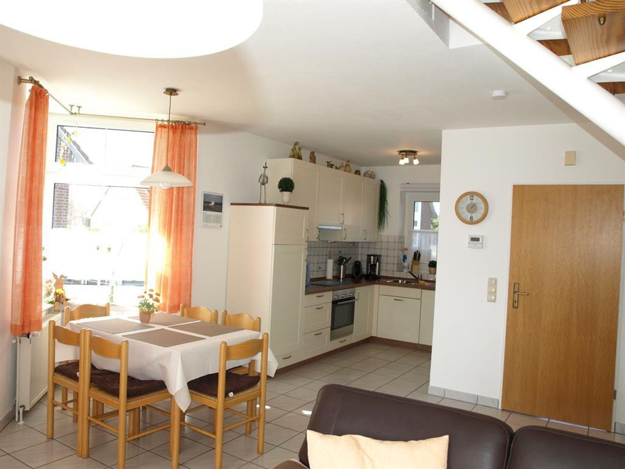 Im Erdgeschoss unserer Doppelhaushälfte befinden sich ein neu möblierter freundlich ausgestatteter Wohn- und Essbereich mit Flachbildfernseher und DVD-Player, eine offene Küche mit Geschirrspüler, Backofen, Mikrowelle und diversen nützlichen Küchengeräten wie u.a. Handrührgerät, Waffeleisen und Brotschneidemaschine. Außerdem eine Gäste-Toilette und ein Abstellraum.