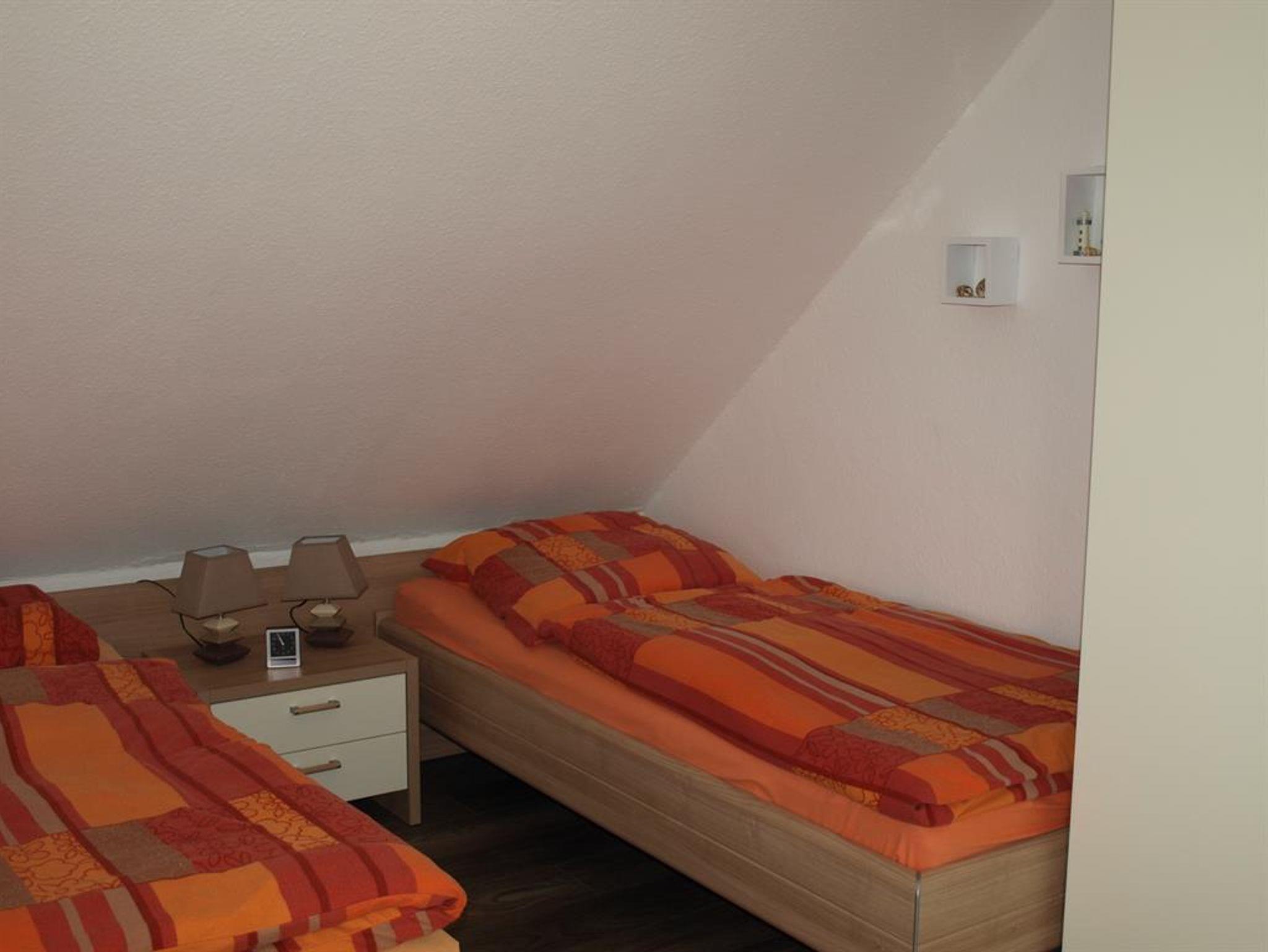 Im Obergeschoss laden ein Schlafzimmer mit einem Doppelbett und einem einzelnen Bett, sowie ein Schlafzimmer mit zwei Einzelbetten zu einer geruhsamen Nacht ein. Beide Schlafräume sind ebenfalls neu möbliert. Für unseren kleinen Gast steht ein Kinderreisebett, ein Kinderhochstuhl sowie Spiele, ein Sandkasten und für den Weg zum Strand ein Bollerwagen zur Verfügung.