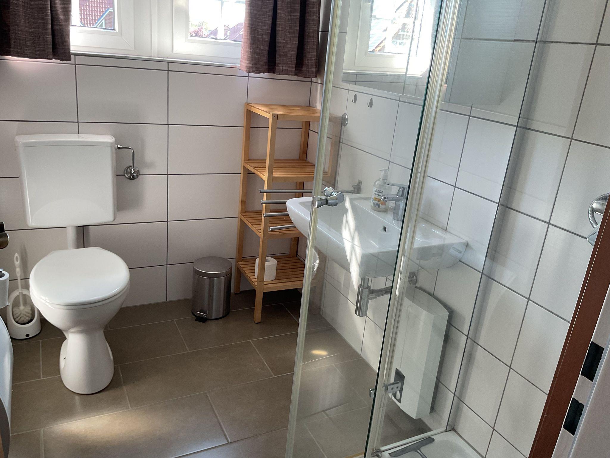 Tageslicht-Badezimmer mit Dusche und WC.