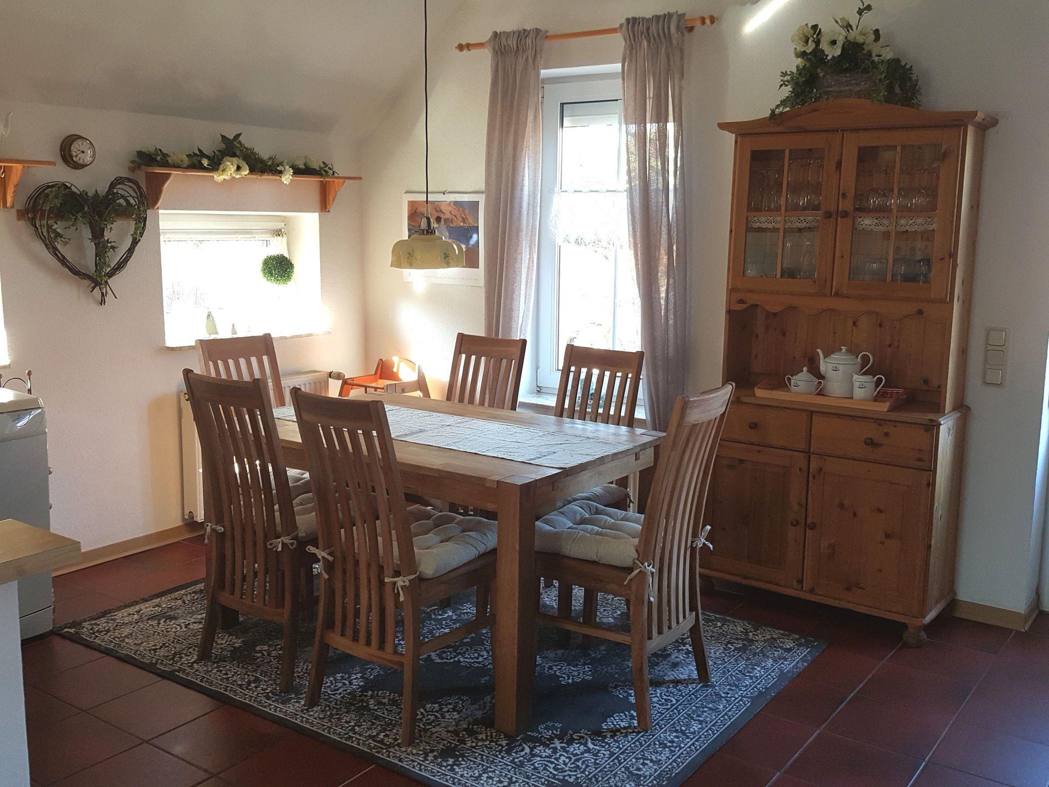 Offener Wohn- und Essbereich mit gemütlicher Couchgarnitur und grossem Flachbild-TV, Essgruppe mit Bestuhlung; Einbauküche mit Spülmaschine, Kühlschrank mit Gefrierfach, VierPlattenElektroherd mit Backofen und allen erforderlichen Elektrogeräten.
