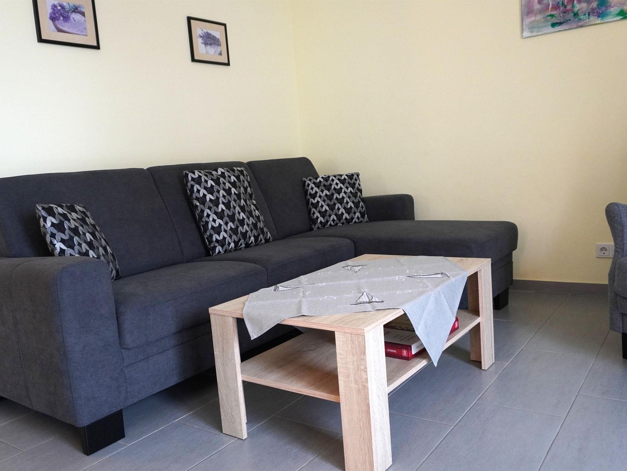 Die Wohnung „Seewind“ befindet sich im Obergeschoss des Hauses und hat einen Balkon. Es gibt eine separate vollausgestattete Küche mit Esstisch, eine Wohnzimmer mit gemütlicher Ledergarnitur und Sat-TV. Als Schlafmöglichkeiten dienen ein Doppel- und ein Zweibettzimmer. Bad mit Dusche und WC.