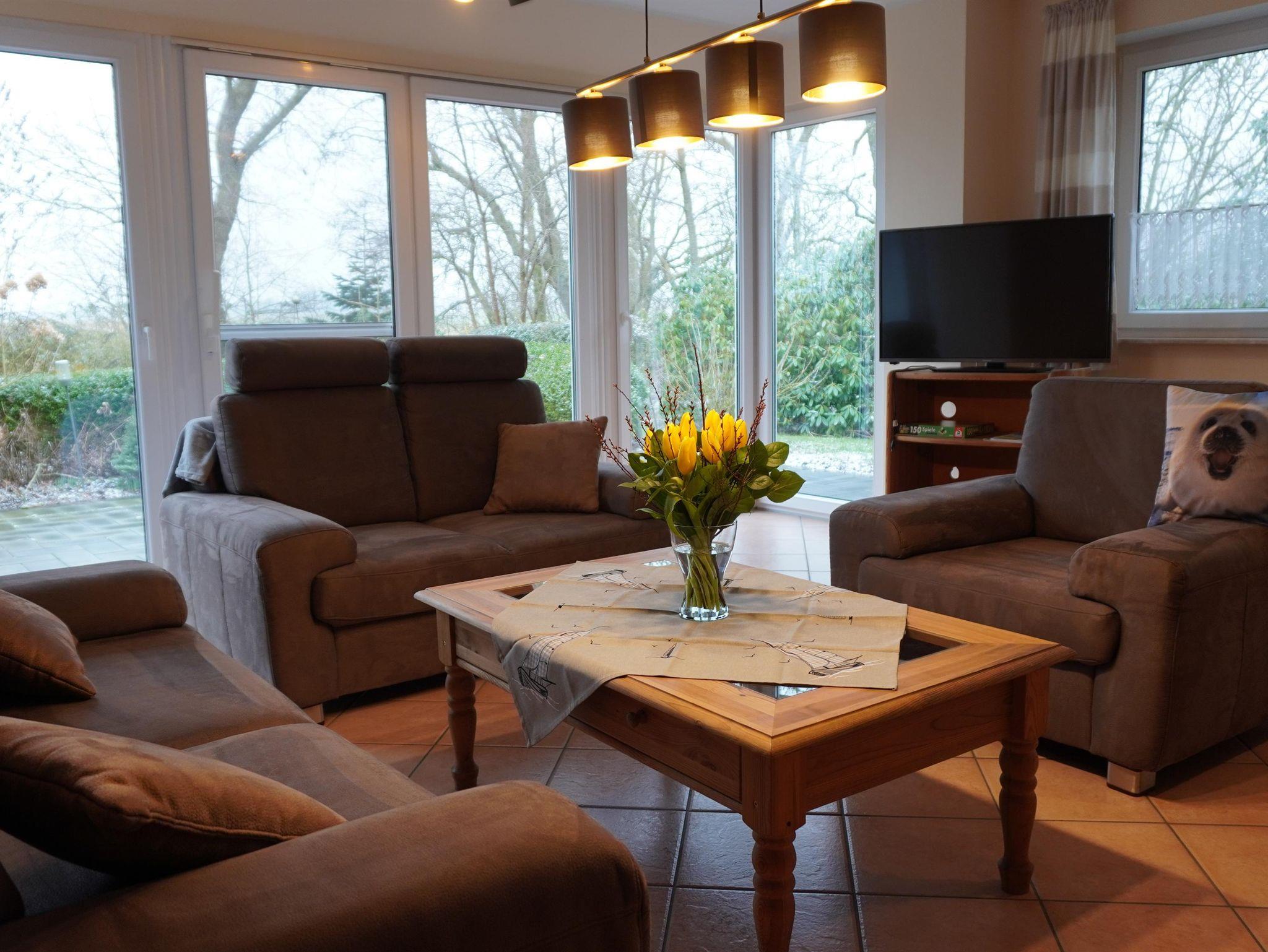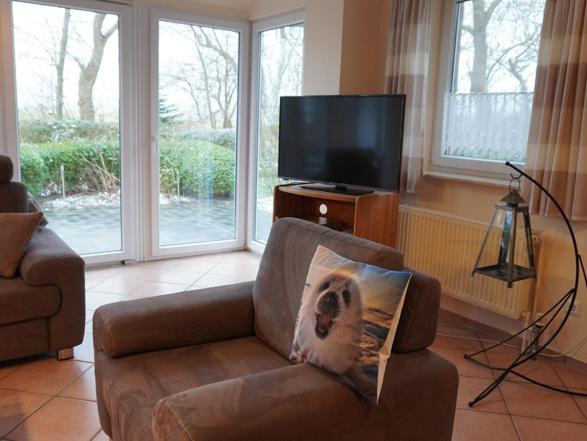 Die Wohnung An't Water befindet im Erdgeschoss unseres Ferienhauses und kann von Rollstuhlfahrern und Personen mit eingeschränkter Mobilität genutzt werden. Vollausgestattete separate Küche mit Esstisch. Das große Wohnzimmer ist mit Sat-TV, einer gemütlichen Sitzgarnitur und einem Kamin ausgestattet. Von hier aus haben Sie einen wunderbaren Blick auf den großen Garten. Die Terrasse lädt zum Verweilen ein. Als Schlafmöglichkeiten finden Sie ein Doppel- und ein Zweibettzimmer vor. Für unsere kleinen Gäste bieten wir ein Reisebettchen und ein Kinderhochstuhl an. Das Bad ist ausgestattet mit einer barrierefreien Dusche, einer Badewanne und WC. Gäste-WC vorhanden.