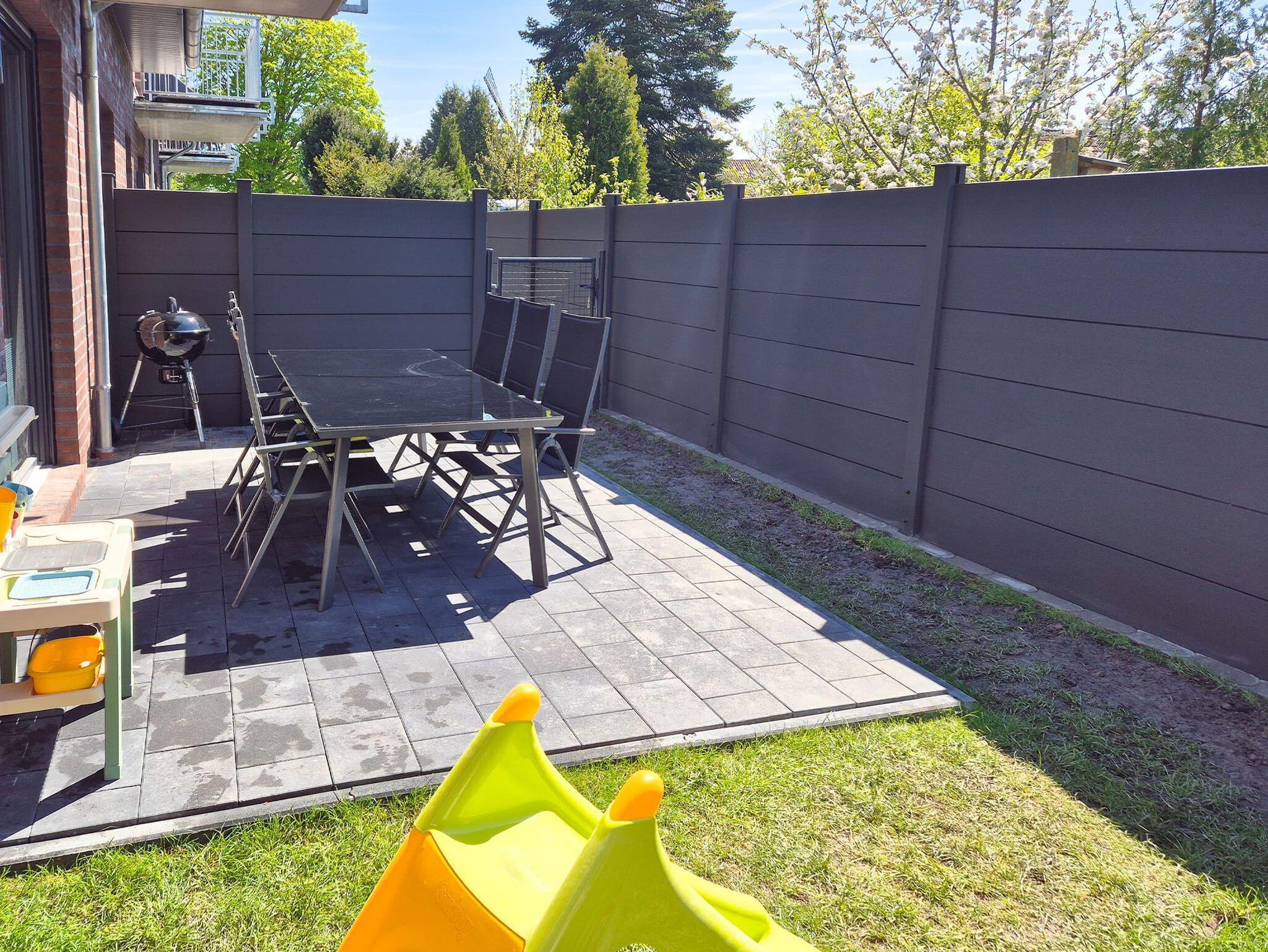 Im eigenen Garten, der komplett eingezäunt ist (Hunde können frei laufen), gibt es einladende Sitzgelegenheiten und Einrichtungen für die Kinder.