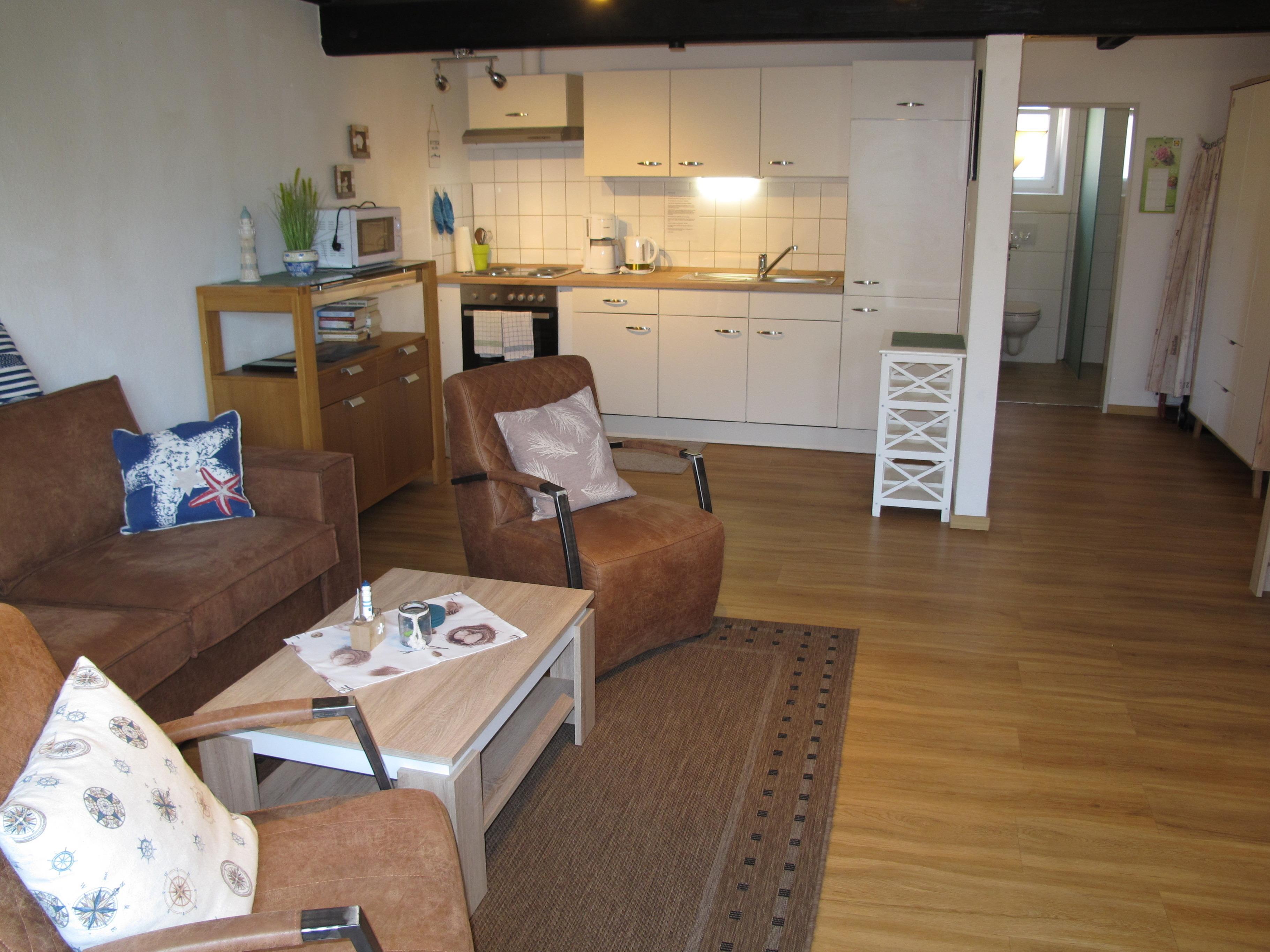 Zugang über Terrasse und separaten Eingang in : großen Wohnraum mit Leder-Sitzgruppe und Eßplatz. Offene Küche mit Einbauherd (4 Platten, Backofen), Mikrowelle, Kaffeemaschine, Wasserkocher, Toaster und Kühlschrank mit Gefrierfach. Doppelzimmer. Renovierte und moderne Dusche/WC. NICHTRAUCHEROBJEKT !