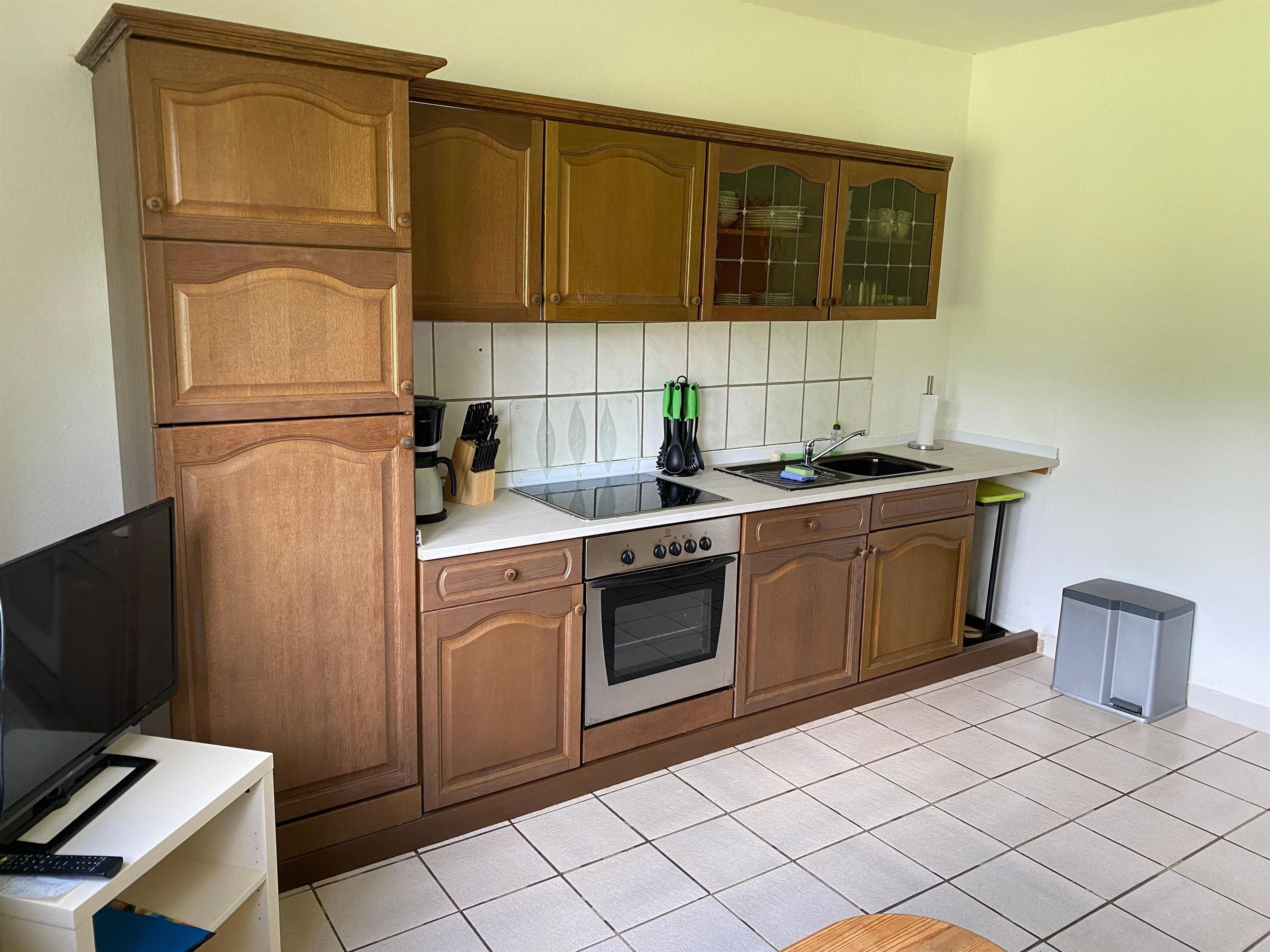 Diese 65 qm große Ferienwohnung hat 6 Räume, bestehend aus einer Wohnküche, zwei Schlafzimmern, Flur, einem Badezimmer und einer separaten Toilette. Der Wohnteil hat ein Sofa, einen Couchtisch und einen SAT-Fernseher. Der Küchenteil ist mit Wasserkocher, Kaffeemaschine, Handmixer, Herd, Backofen, Toaster, Kühlschrank, Geschirr, Besteck, Pfannen und Töpfen ausgestattet. Im Flur steht ein Eßtisch mit 4 Stühlen.