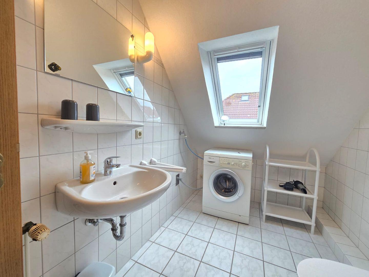 Im Obergeschoss befinden sich zwei Schlafzimmer: Ein Schlafzimmer mit Doppelbett und ein Schlafzimmer mit zwei Einzelbetten. Das helle Badezimmer verfügt über eine ebenerdige Dusche, WC und eine Waschmaschine, sodass Sie sich rundum wohlfühlen können. Bettwäsche und Handtücher können auf Wunsch gegen Aufpreis hinzugebucht werden.