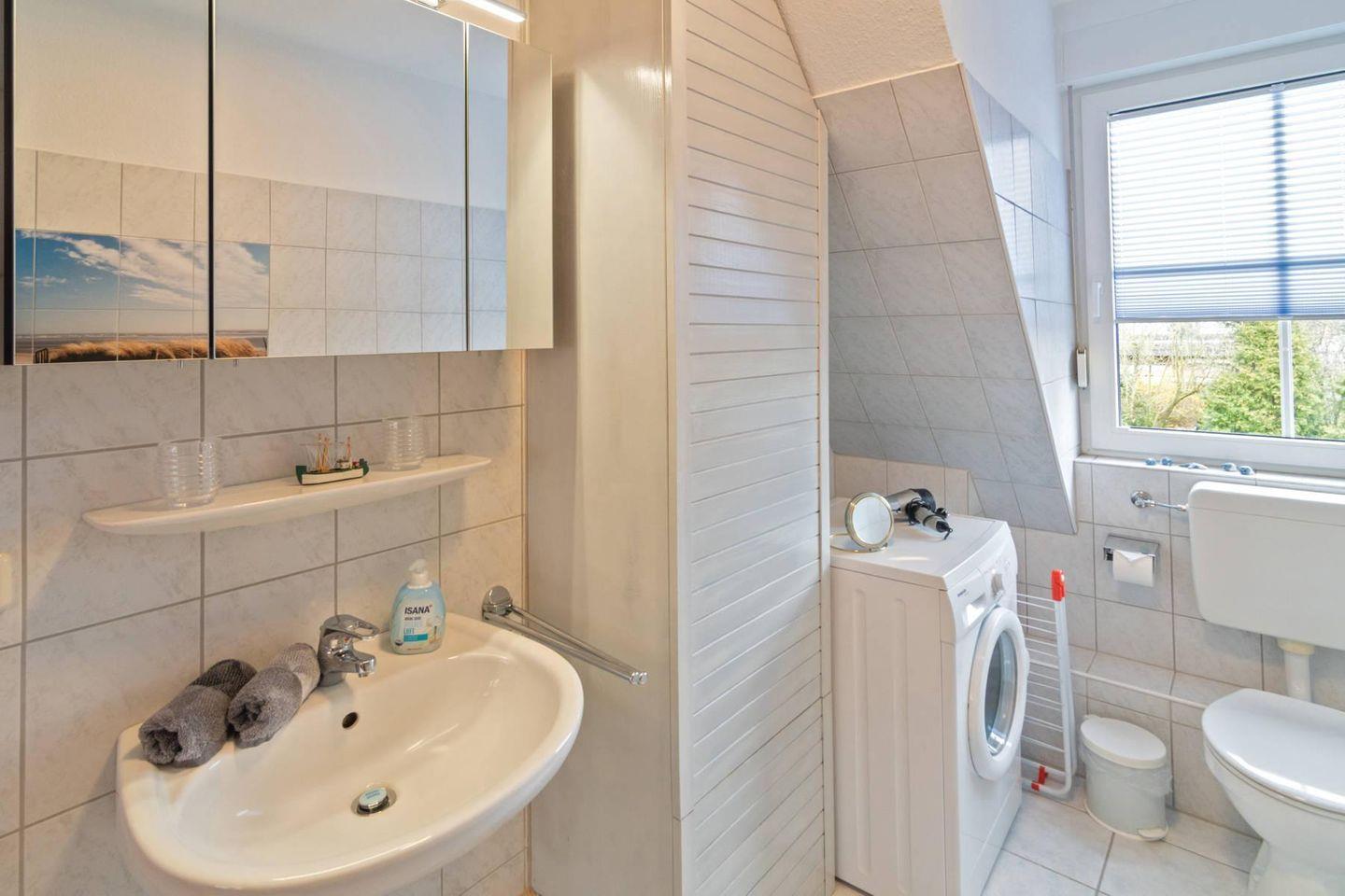 Im Obergeschoss finden Sie zwei Schlafzimmer – eines mit einem Doppelbett und das andere mit zwei Einzelbetten – sowie ein zusätzliches Badezimmer mit Badewanne und WC. Über eine platzsparende Treppe gelangen Sie von einem der Schlafzimmer in ein weiteres Zimmer im Dachgeschoss, das mit einem bequemen Schlafsofa ausgestattet ist. Dieser Raum ohne Tür eignet sich besonders gut als Rückzugsort oder als Spielbereich für Kinder.