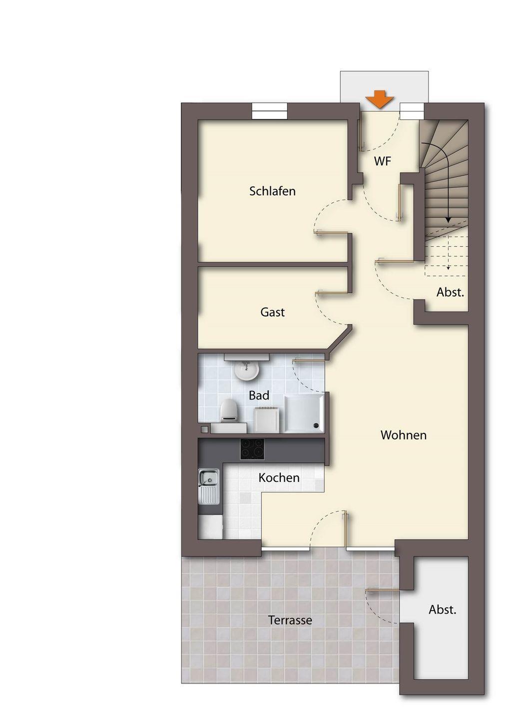 Im offenen Wohn- und Essbereich befinden sich Sofa, Esstisch und eine voll ausgestattete Küche (Ceran-Herd, Backofen, Kühlschrank mit Gefrierfach, Spülmaschine, Kaffeemaschine, Wasserkocher, Toaster, Mixer, Geschirr, Besteck, (Extras: Milchaufschäumer, Wasserfilteranlage, Sodastream-Sprudler (ohne Kartusche)). Zwei Schlafzimmer bieten Platz für bis zu vier Personen, (kleines Zimmer kein Fenster, Oberlicht zum Wohnzimmer). Das Bad verfügt über bodengleiche Dusche, WC, Waschbecken. Fußbodenheizung, Waschmaschine, Bügeleisen und -Brett runden den Komfort ab. Am Schlafzimmerfenster sowie vor dem rechten Terrassenfenster befindet sich ein festes Insektenschutzgitter.