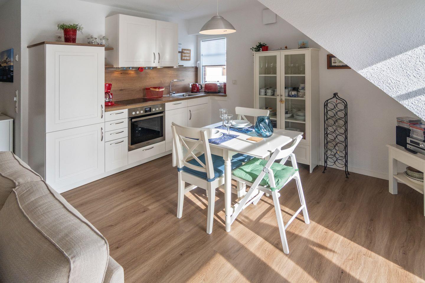 Die offene Küche neben dem Wohnzimmer ist mit modernen Geräten ausgestattet, darunter ein Herd, ein Backofen, sowie eine Spülmaschine und ein Kühlschrank mit Gefrierfach. Hier können Sie Ihre Kochkünste entfalten und köstliche Mahlzeiten zubereiten. Des Weiteren stehen Ihnen Küchenutensilien, Wasserkocher, Toaster und eine Kaffeemaschine zur Verfügung, sodass Sie sich rundum wohlfühlen können.