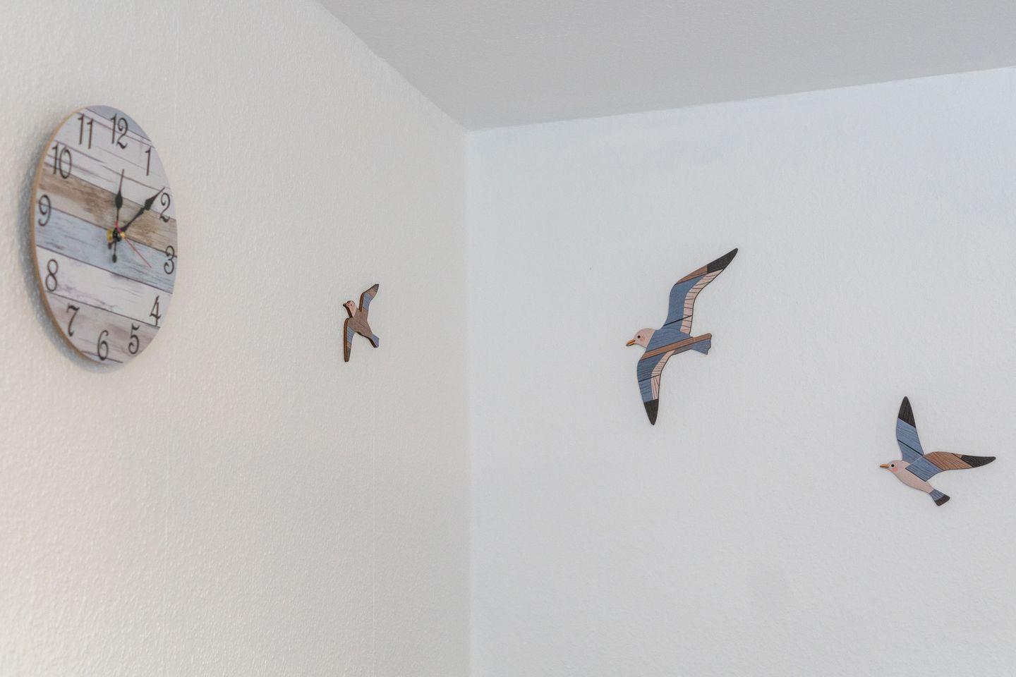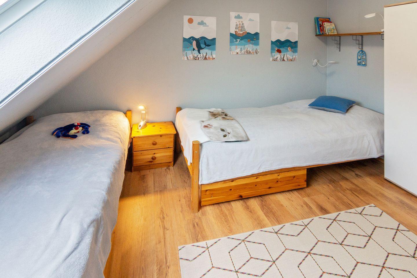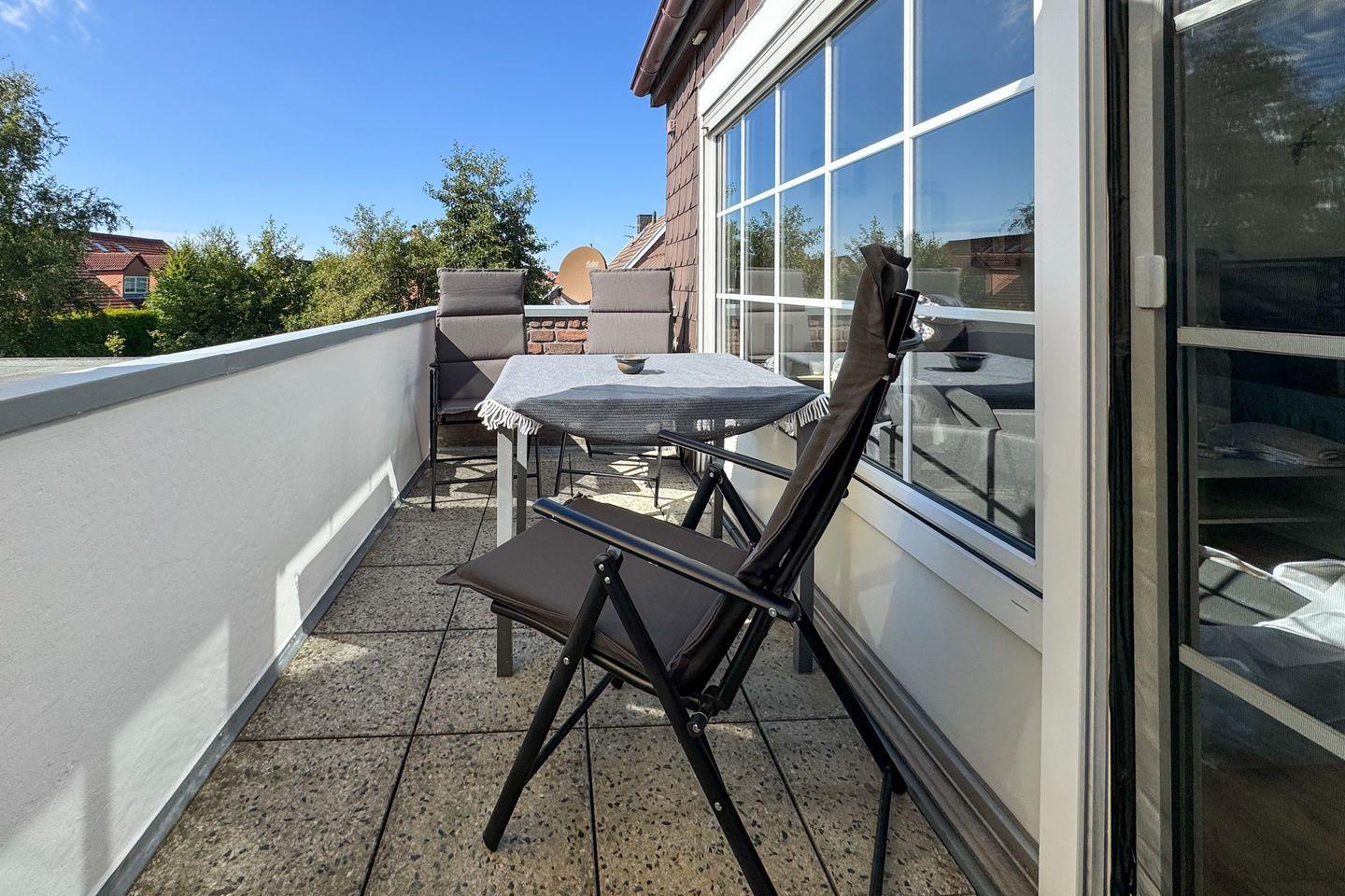 Die Wohnung umfasst drei Zimmer, darunter zwei Schlafzimmer mit Laminatböden. Im unteren Schlafzimmer steht ein Kinderreisebett bereit. Das zweite Schlafzimmer mit Ehebett befindet sich im ausgebauten Dachgeschoss, erreichbar über eine schmale Treppe. Der helle Wohnbereich ist offen gestaltet, mit Sitzecke, Essbereich und einem Balkon mit Gartenmöbeln und Sonnenschirm für entspannte Stunden.