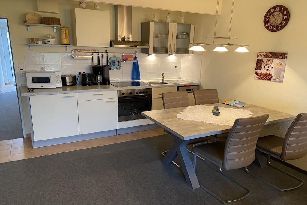 Denne moderne ferieleiligheten ligger i første etasje, som du kan nå via trapper eller heis. Leiligheten har en smakfullt møblert stue med integrert kjøkkenkrok og spiseplass, et soverom med dobbeltseng, garderobe og TV, et bad med dusj, en gang og en bod. En komfortabel sovesofa gir et ekstra sovealternativ. Alle vinduer er utstyrt med myggnett og rulleskodder. Nyt det vakre været på den sørvendte balkongen (med sitteplasser). En parkeringsplass er tilgjengelig for bilen din. Stranden og det vakre Vadehavet ligger bare noen få skritt unna. En reiseseng og en barnestol kan lånes gratis på stedet.