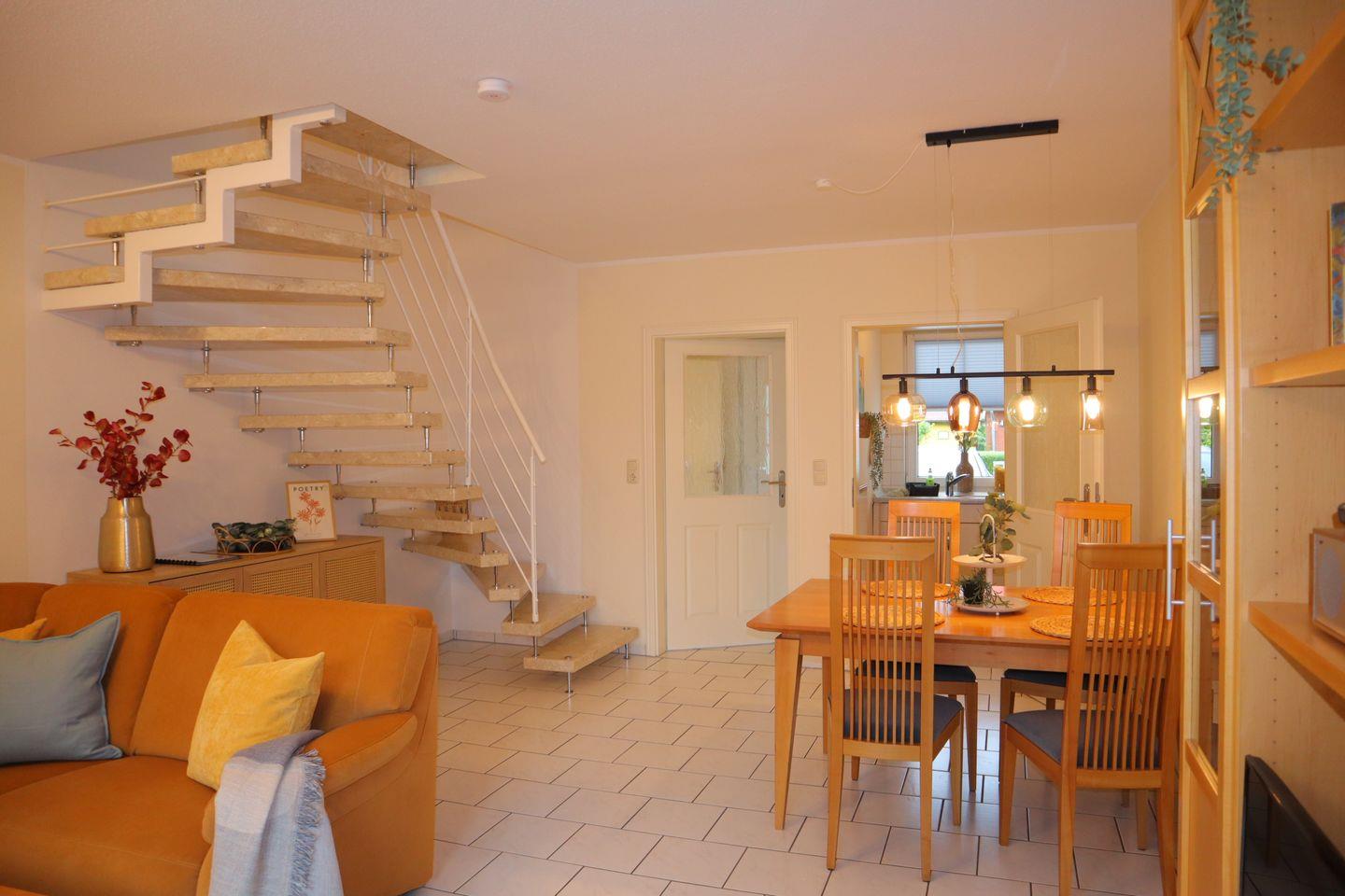 Das liebevoll eingerichtete Reihenmittelhaus bietet auf 70 m² alles, was Sie für einen erholsamen Urlaub brauchen. Zwei separate Schlafzimmer sorgen für Privatsphäre und einen erholsamen Schlaf. Der helle und großzügige Wohnbereich mit gemütlicher Sofaecke, moderner Fußbodenheizung und offener Einbauküche ist der perfekte Treffpunkt für gemeinsame Stunden. Die Küche ist mit allem ausgestattet, was das Herz begehrt – vom Ceranherd bis zum Gefrierschrank – und lädt zu genussvollen Kochmomenten ein.