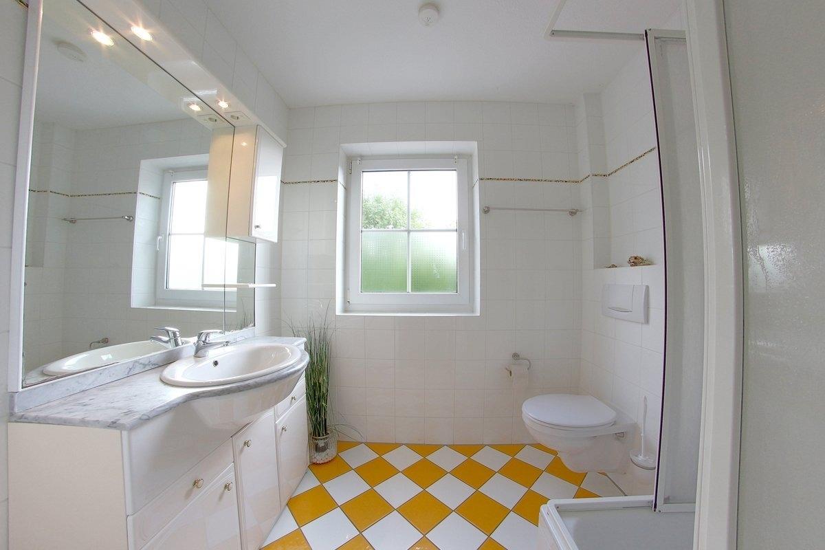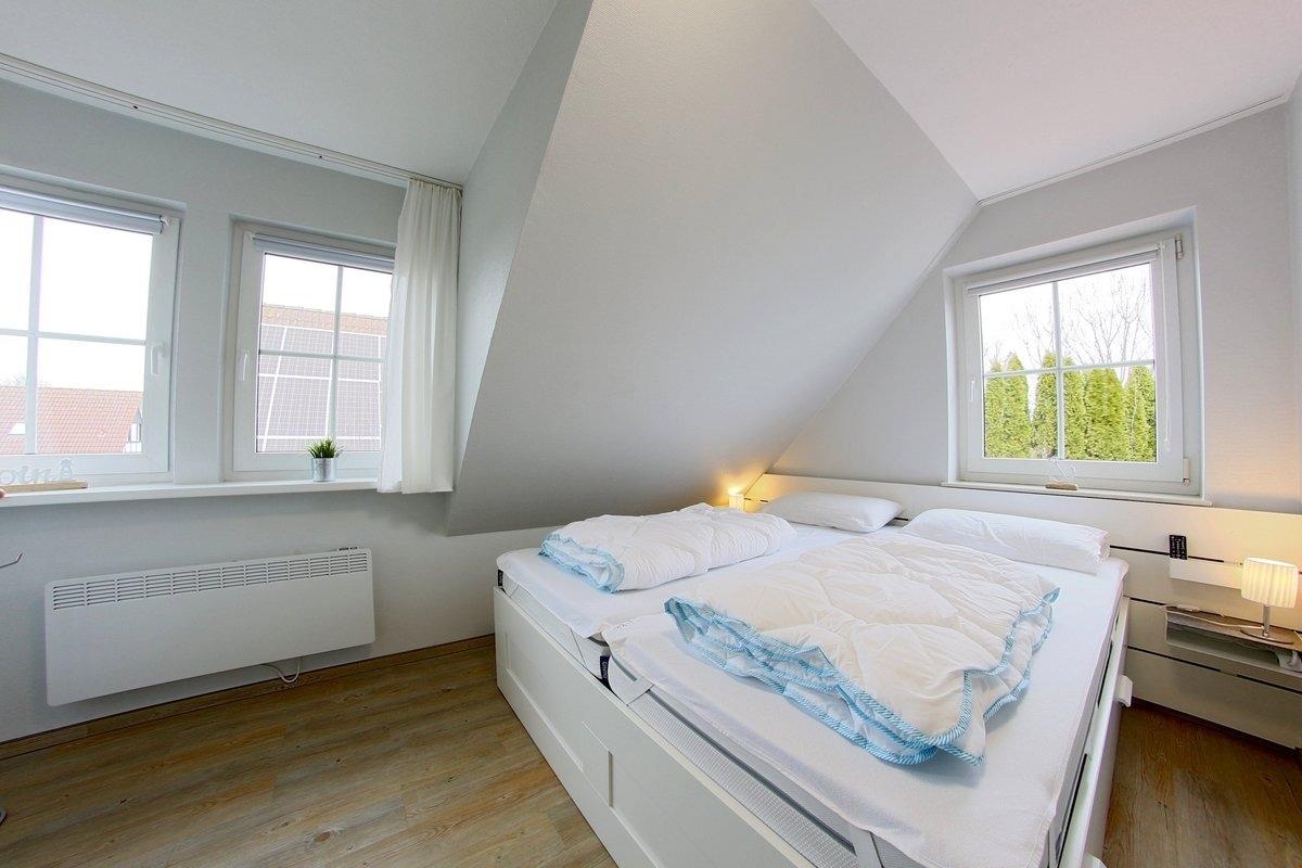 Im Obergeschoss befinden sich zwei Schlafzimmer, eins mit Doppelbett mit Smart TV und eins mit 2 Einzelbetten, sowie ein hell gefliestes Duschbad mit Regendusche, Fußbodenheizung und Fenster. Vinylbelag befindet sich in den oberen Räumen.