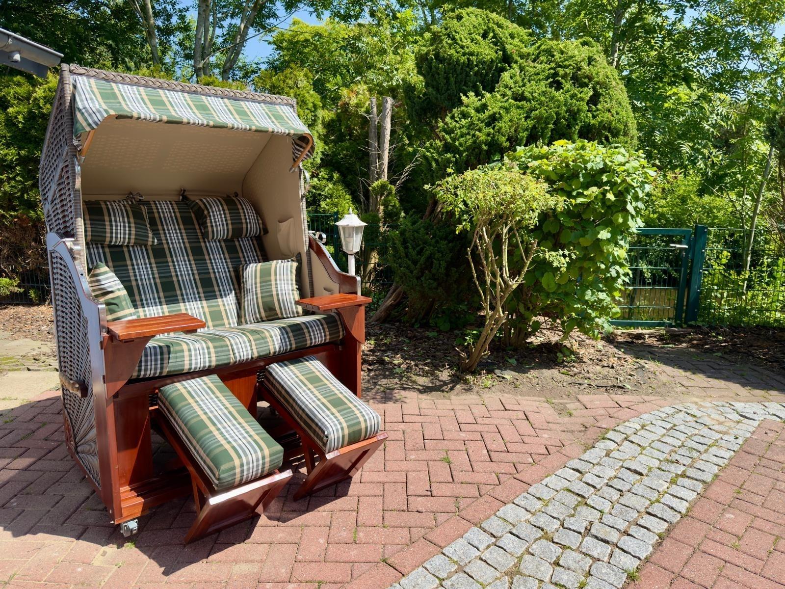 Auf der sonnigen Terrasse mit Gartenmöbeln, Strandkorb und Gartenhaus können Sie relaxen und die Sonne genießen. Bis zum Deich mit Kutterhafen , Wellenfreibad und Grünstrand sind es nur wenige Gehminuten.