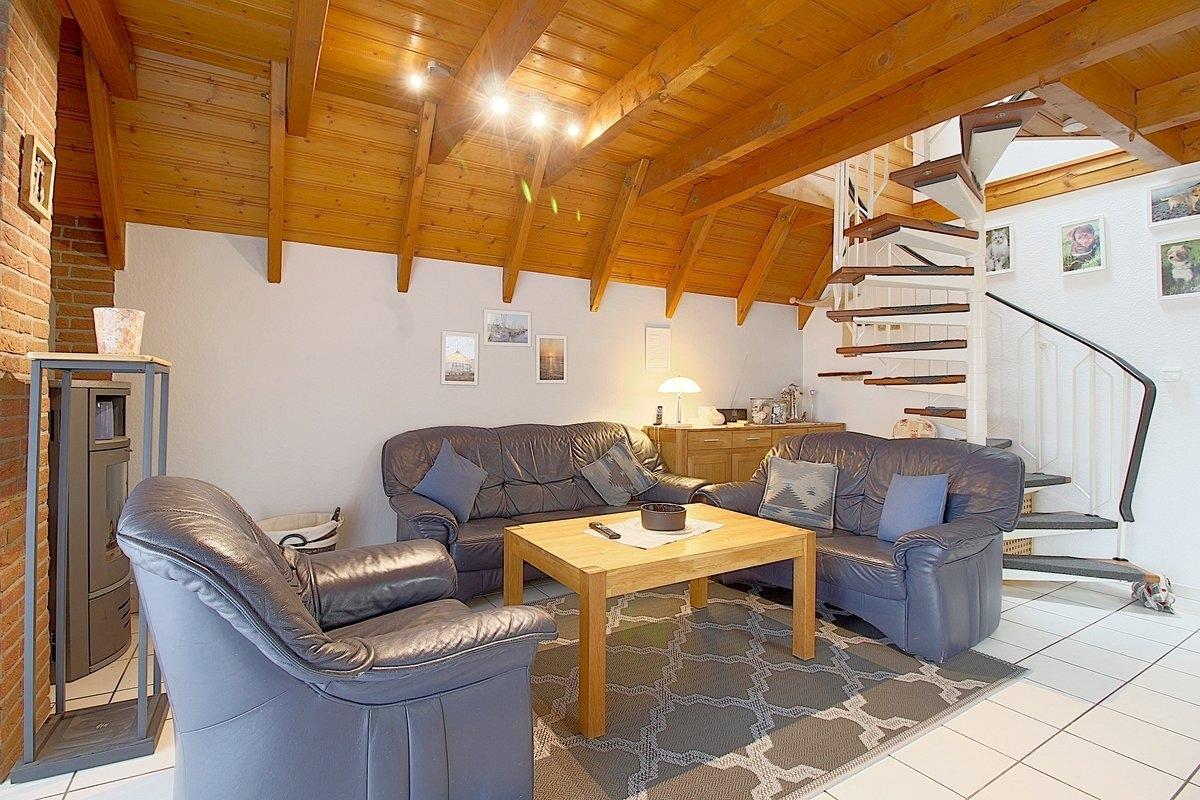 Im modern gestalteten, im Erdgeschoss komplett gefliesten Haus gibt es einen offenen Wohnbereich mit Flat-TV, Kaminofen für die kältere Jahreszeit, Essplatz und Küche mit komplett ausgestatteter moderner Einbauküche. Vom Wohnraum aus geht es direkt auf die Terrasse.
