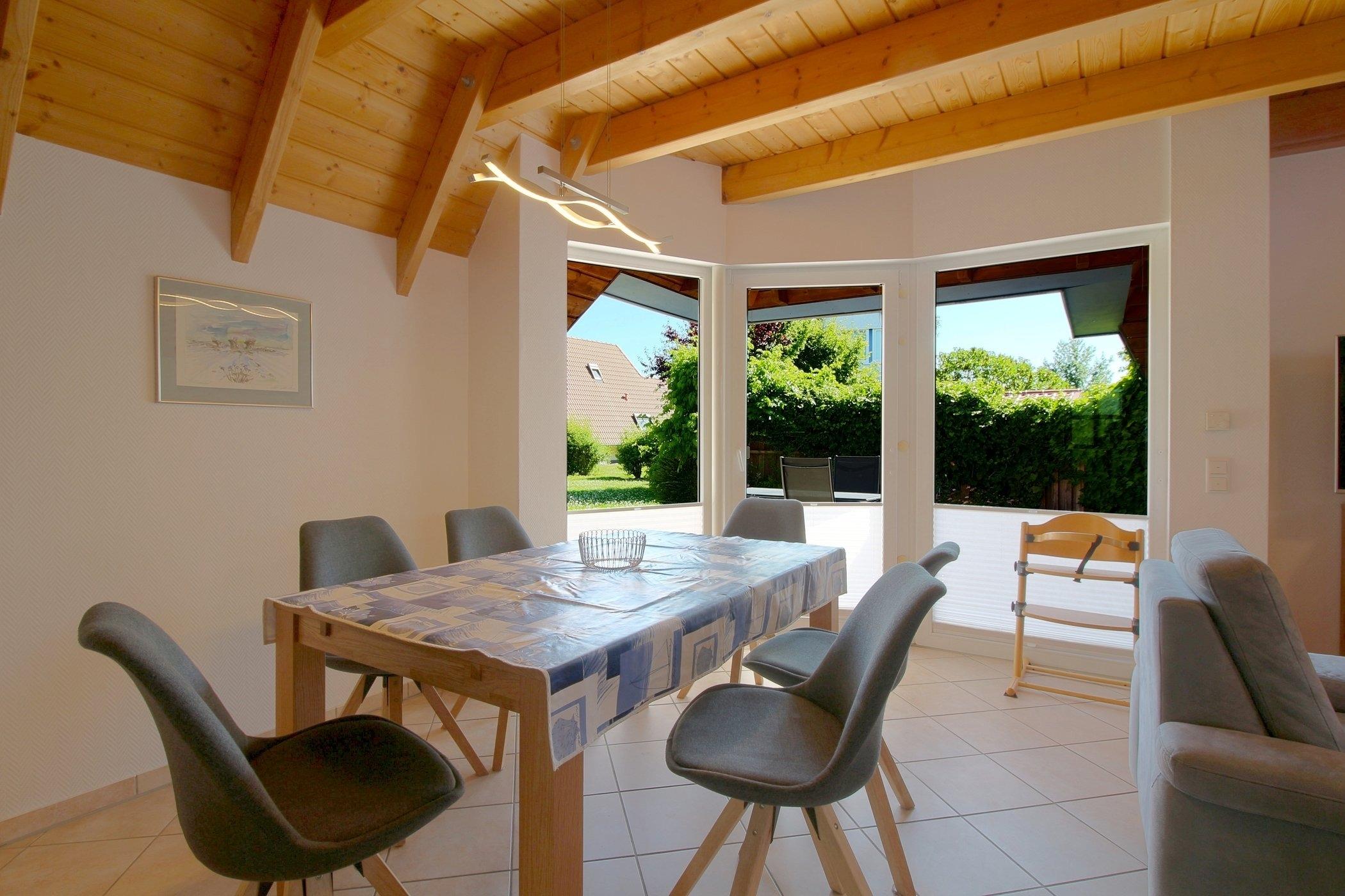 Im gefliesten Erdgeschoss gibt es einen offenen Wohnbereich mit Kamin und großem großen Flat-TV, Internet mit Glasfaserkabel für die schnelle Verbindung. Ein sonniger Essplatz und Küche mit komplett ausgestatteter moderner Einbauküche und zweitem Kühlschrank im Abstellraum stehen den Gästen hier zur Verfügung. Von hier aus geht es auf die Terrasse mit Abstellraum und Gartenmöbeln. Ein Hochstuhl für die kleine Gäste steht bereit. Im Abstellraum draußen steht ein 2. Kühlschrank bereit.