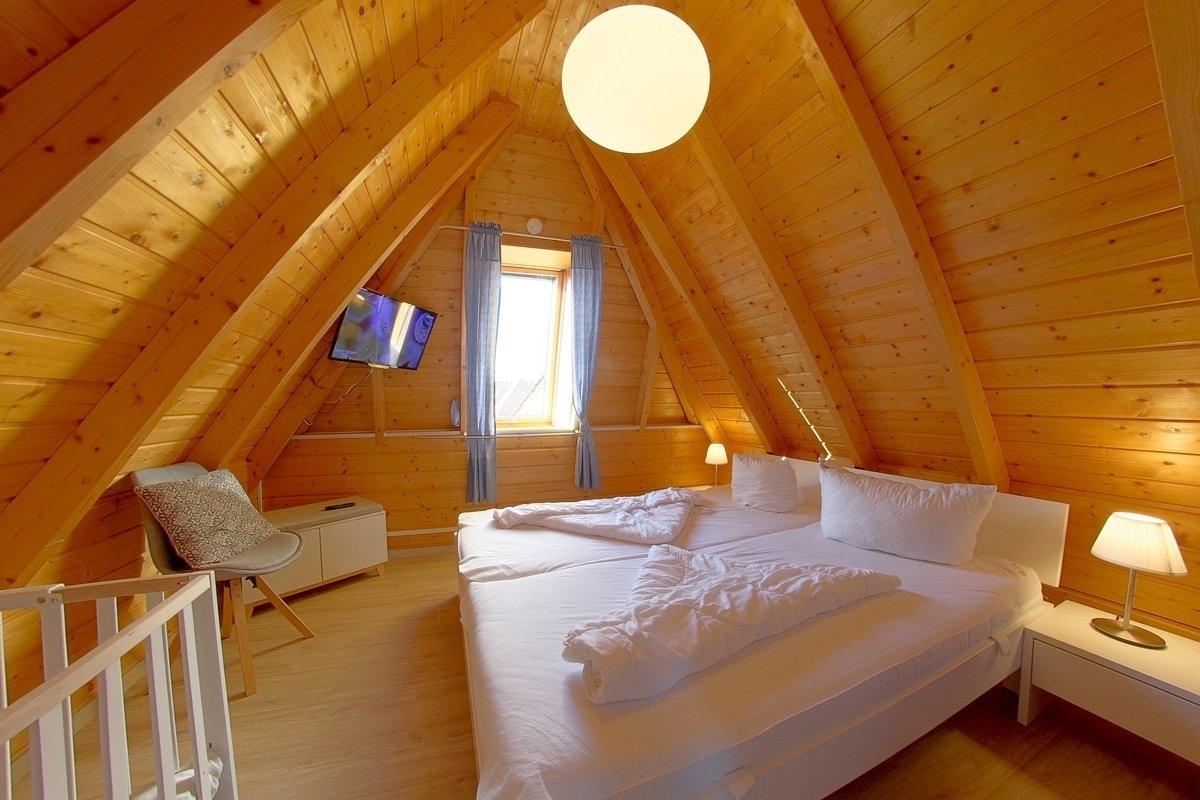 Im Obergeschoss befinden sich zwei weitere Schlafzimmer mit wischbaren Böden und ein WC mit Waschbecken. Ein Schlafzimmer mit Doppelbett und Gitterbett für ein Kleinkind und ein weiteres Schlafzimmer mit 2 Einzelbetten. Alle Schlafräume können verdunkelt werden.