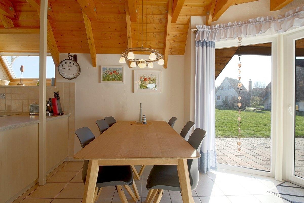 Im gefliesten Wohnbereich gibt es einen offenen Bereich mit Kaminofen, Smart TV und PS4, sowie einen Essbereich, in dem 6 Personen ausreichend Platz finden.