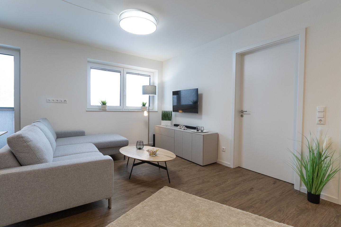 Der helle Wohnbereich bietet eine gemütliche Couch, Smart-TV und Zugang zur großen Terrasse mit Blick ins Grüne. Hier genießt du dein Frühstück oder einen entspannten Abend. Die offene Küche ist komplett ausgestattet und lädt zu gemeinsamen Mahlzeiten ein.