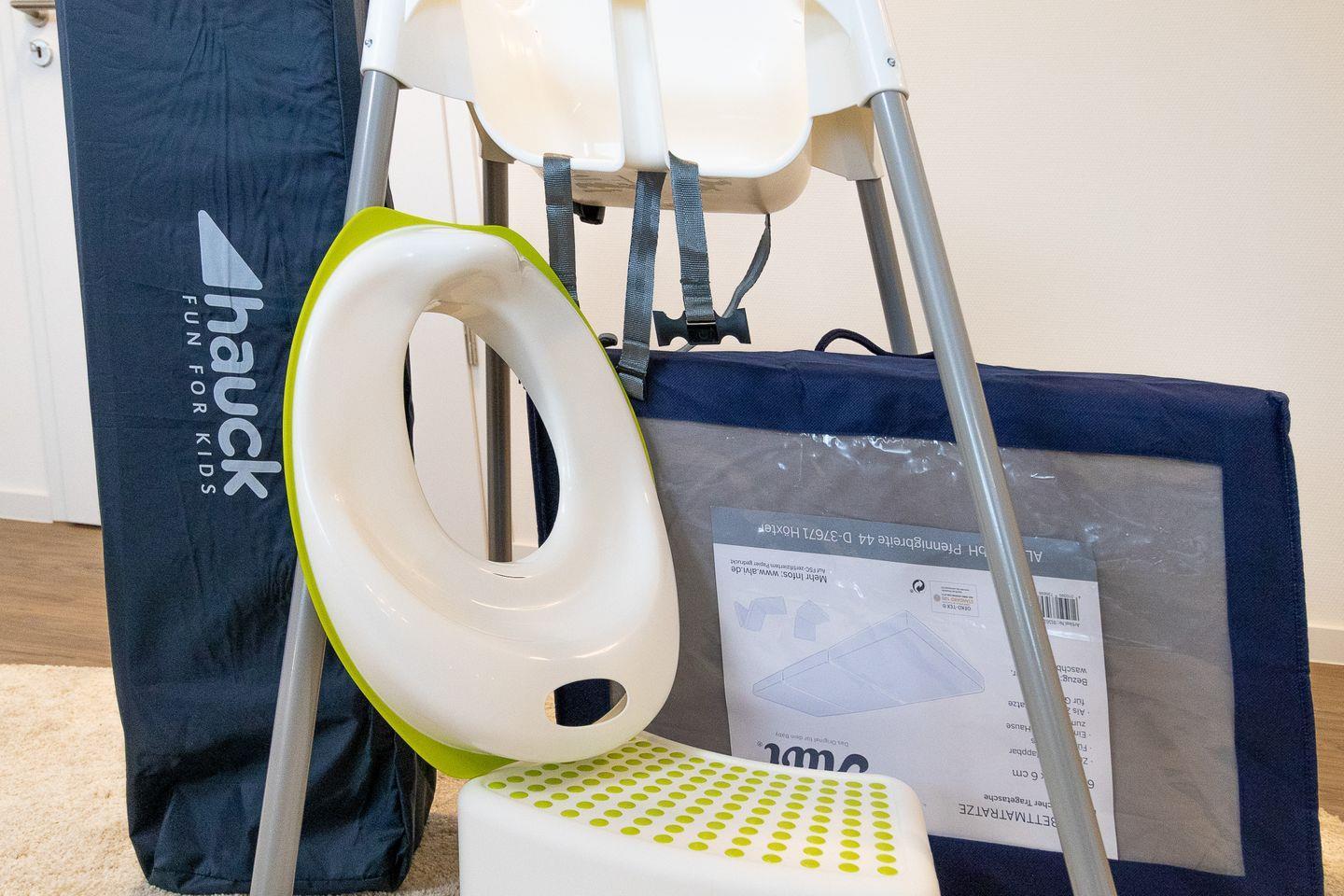 Ein Reisebett und ein Hochstuhl stehen bereit. Im Garten gibt es eine kleine Spielecke mit Schaukel und Rutsche.