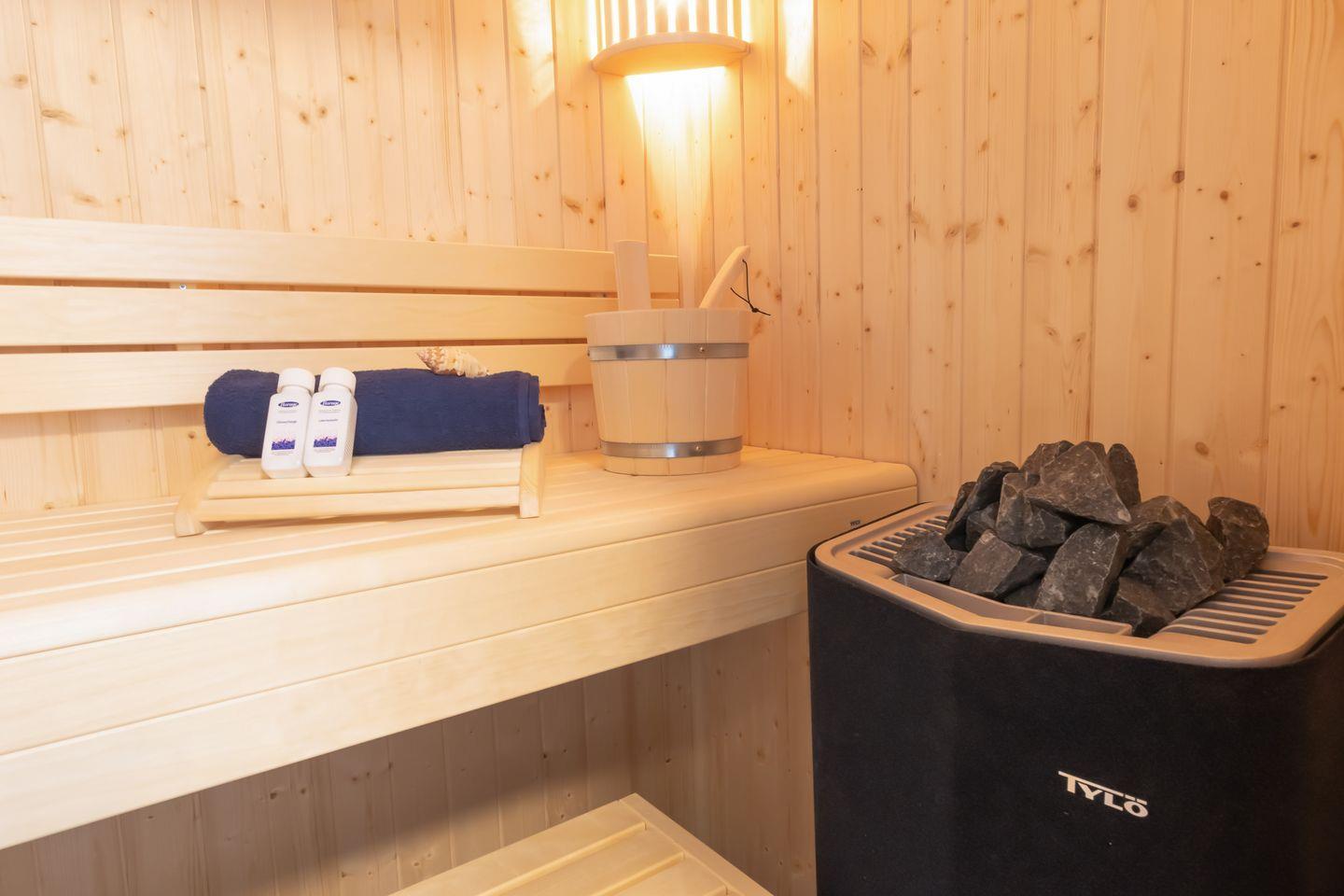 Das moderne Badezimmer ist deine private Wohlfühloase – mit bodentiefer Dusche und exklusiver Sauna für entspannende Momente nach einem Tag am Meer.