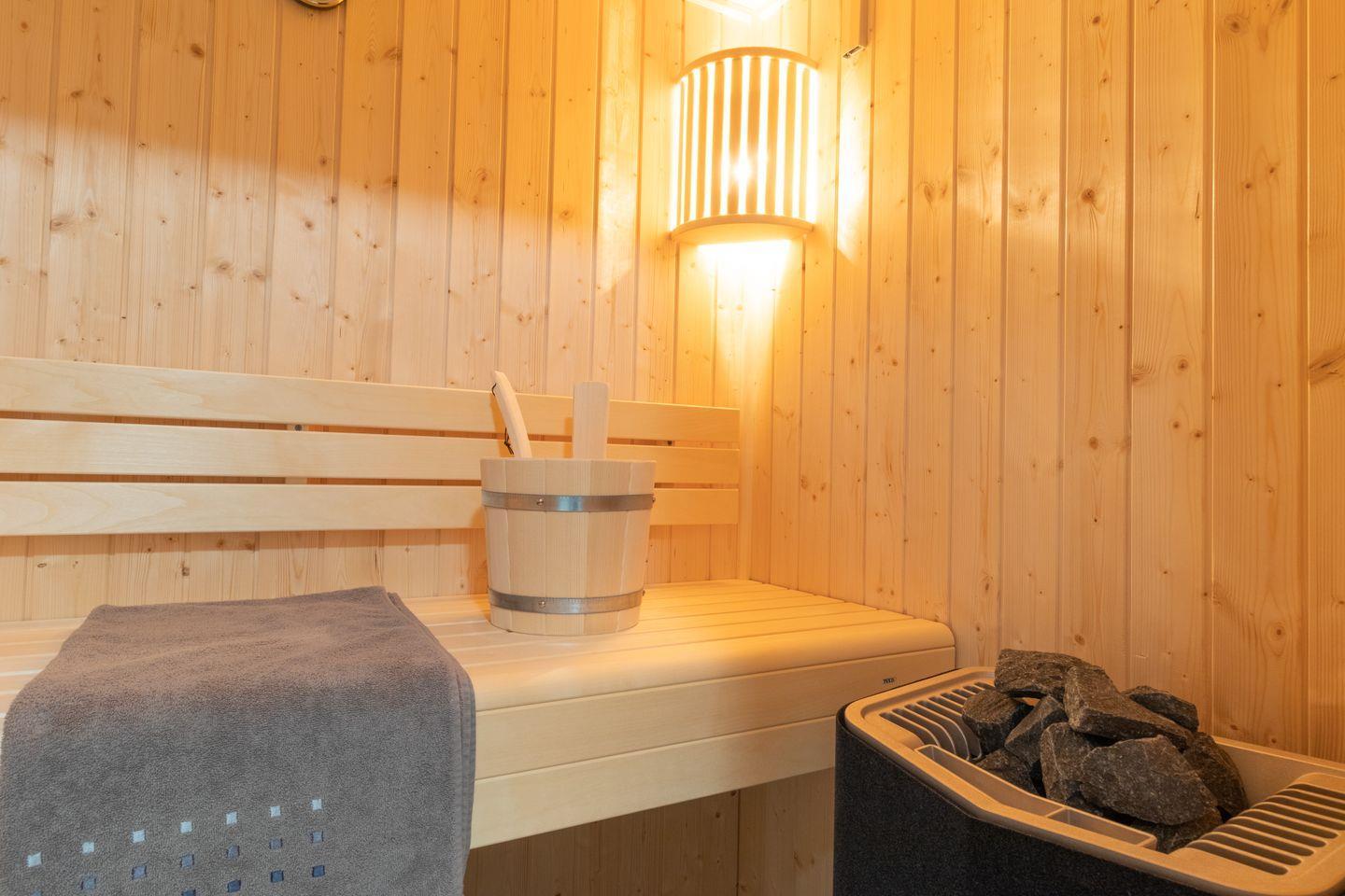 Das Tageslichtbad punktet mit einer ebenerdigen Dusche, Sauna, modernem Waschtisch, WC und Handtuchheizung – hier startet dein Urlaubstag frisch und angenehm.