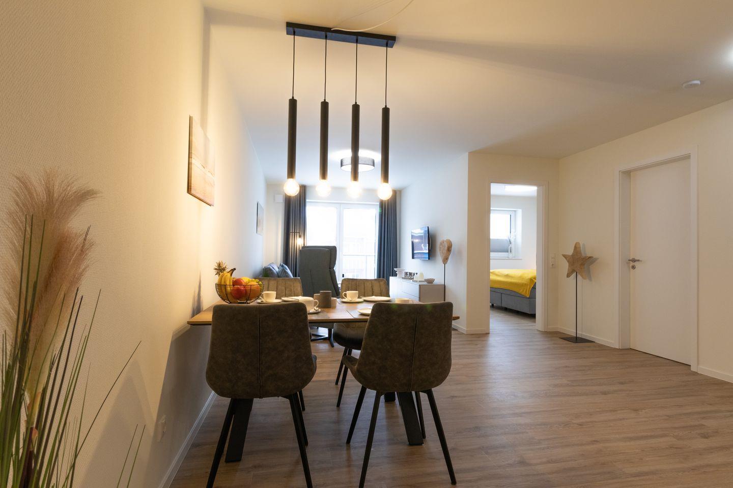 Im offenen Wohn- und Essbereich erwarten dich eine komfortable Couch, ein Flachbild-TV sowie ein heller Essplatz mit Blick in den Außenbereich. Durch die große Fensterfront gelangst du direkt auf die windgeschützte Terrasse – perfekt zum Entspannen bei Sonne und frischer Brise.