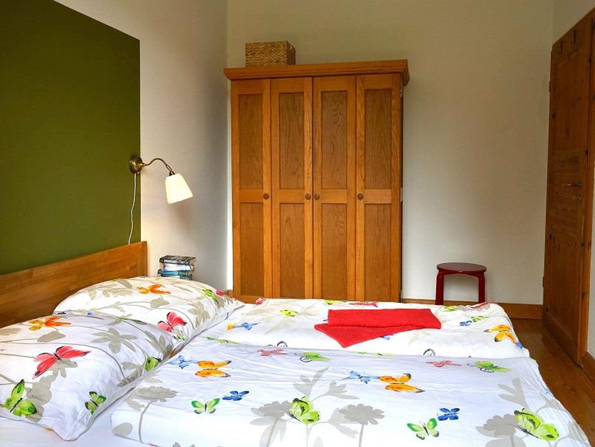 Die Ferienwohnung mit seperatem Zugang liegt auf der Südseite des reetgedecktem Bauernhauses, mit Blick auf Blumengarten und Storchennest. Dielenfußboden in Wohn- und Schlafraum, Fliesen in der Küche, im Bad und im Flur. Die Ausstattung ist einfach und gemütlich mit Flachbildfernseher, Leseecke, Bücherauswahl und Sofa, dass sich für 2 zusätzliche Schlafplätze ausziehen lässt.