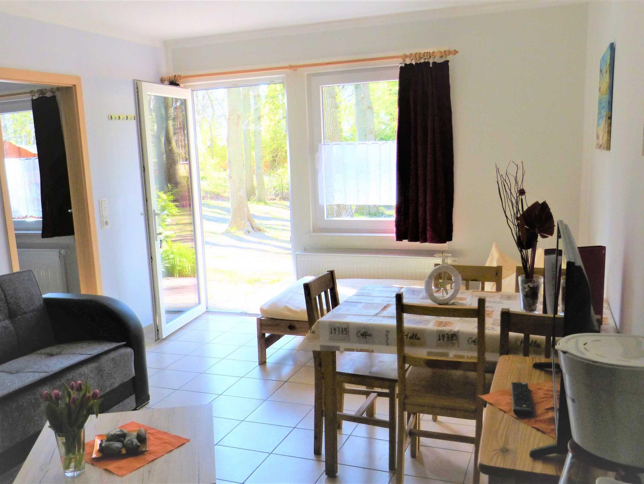 Die Ferienwohnung liegt im Erdgeschoß, hat eine Größe von 38 m² und verfügt über einen Wohnraum mit Pantry, ein Schlafzimmer mit einem Doppel- und einem Etagenbett, ein Badezimmer und eine Terrasse. Im Wohnzimmer befindet sich ein weiteres Einzelbett, zudem ist eine Aufbettung möglich (Schlafsofa). In der Miniküche befinden sich zwei Kochplatten, eine Kaffemaschine, ein Wasserkocher, ein Toaster, ein Kühlschrank mit Gefrierfach sowie eine Mikrowelle. Wäsche kann zugebucht werden (Handtuch- Bettwäschepaket 25,00 pro Person). Im Ferienpark kann ein Grill gemietet werden, ebenso ist die Nutzung einer gemeinschaftlichen Waschmaschine möglich (gegen Gebühr).