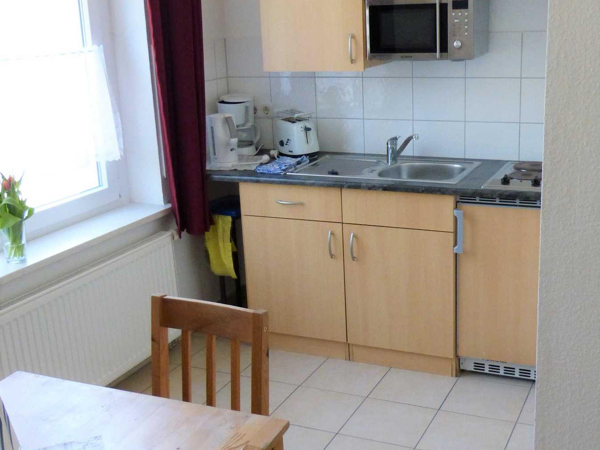 Die Ferienwohnung liegt im 1. Obergeschoß, hat eine Größe von 26 m² und verfügt über einen Wohnraum mit Pantry, ein Schlafzimmer mit einem Doppel- und einem 3-er Etagenbett und ein Badezimmer. Die Terrasse vor dem Haus kann gemeinschaftlich genutzt werden. In der Miniküche befinden sich zwei Kochplatten, eine Kaffemaschine, ein Wasserkocher, ein Toaster, ein Kühlschrank mit Gefrierfach sowie eine Mikrowelle. Wäsche kann zugebucht werden ((Handtuch- Bettwäschepaket 25,00 pro Person). Im Ferienpark kann ein Grill gemietet werden, ebenso ist die Nutzung einer gemeinschaftlichen Waschmaschine möglich (gegen Gebühr).