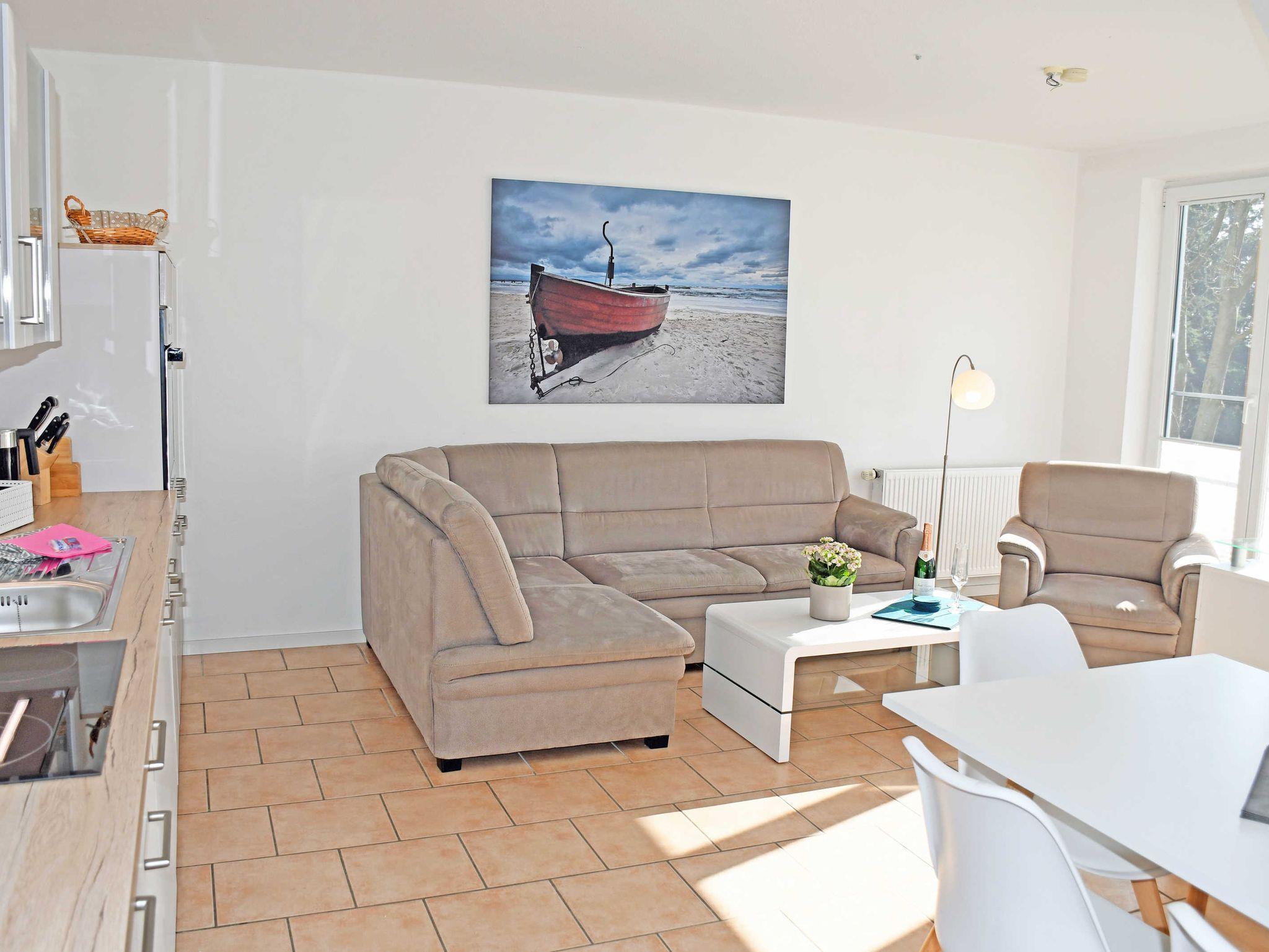 Gäste dieser Ferienwohnung können auch ein kostenloses WLAN-Internet nutzen. Im hellen Wohnraum befinden sich eine bequeme Sitzcouch mit einem Tisch, ein modernes Flachbild-TV-Gerät. Hier steht auch ein Esstisch mit Stühlen.