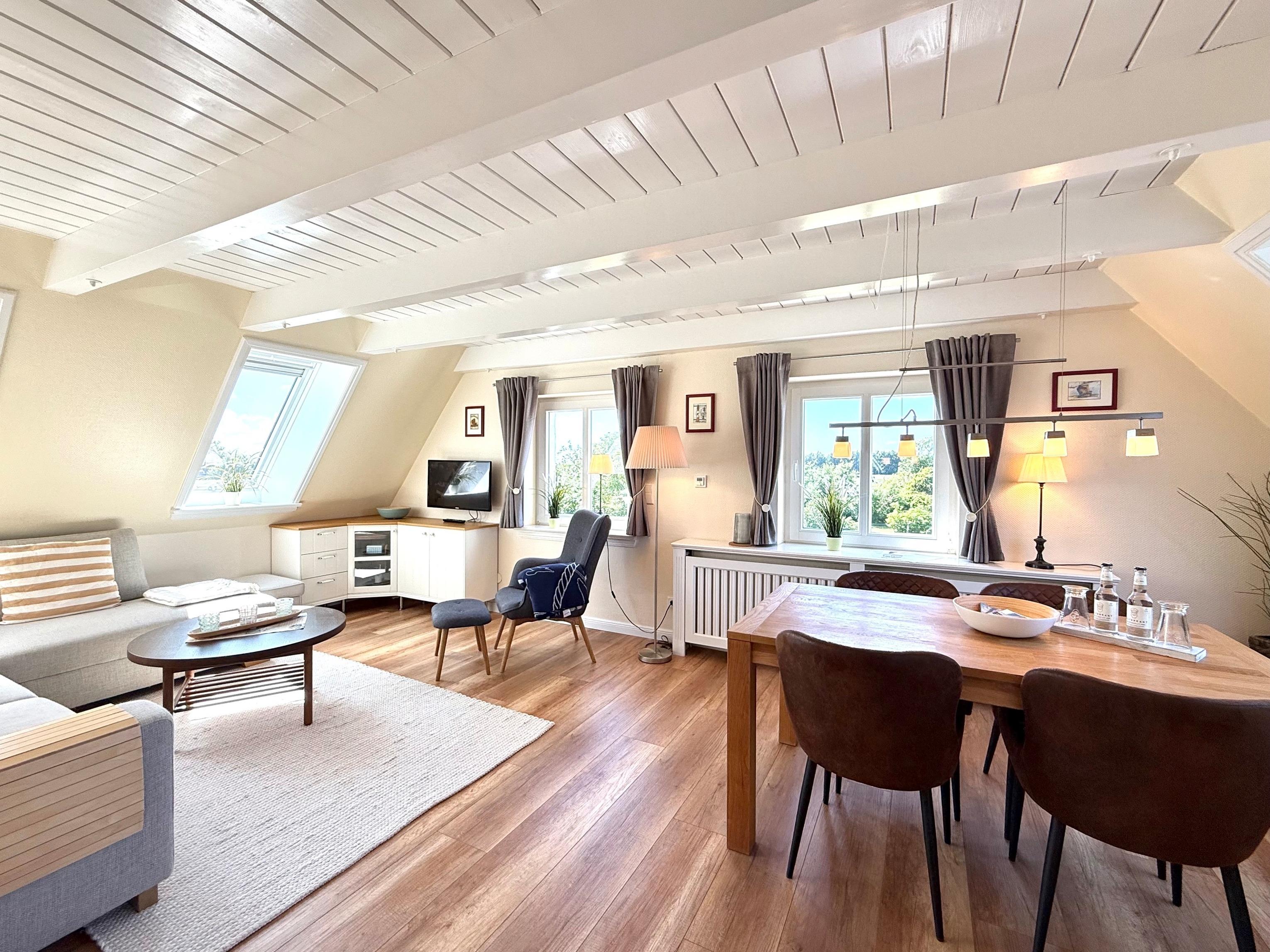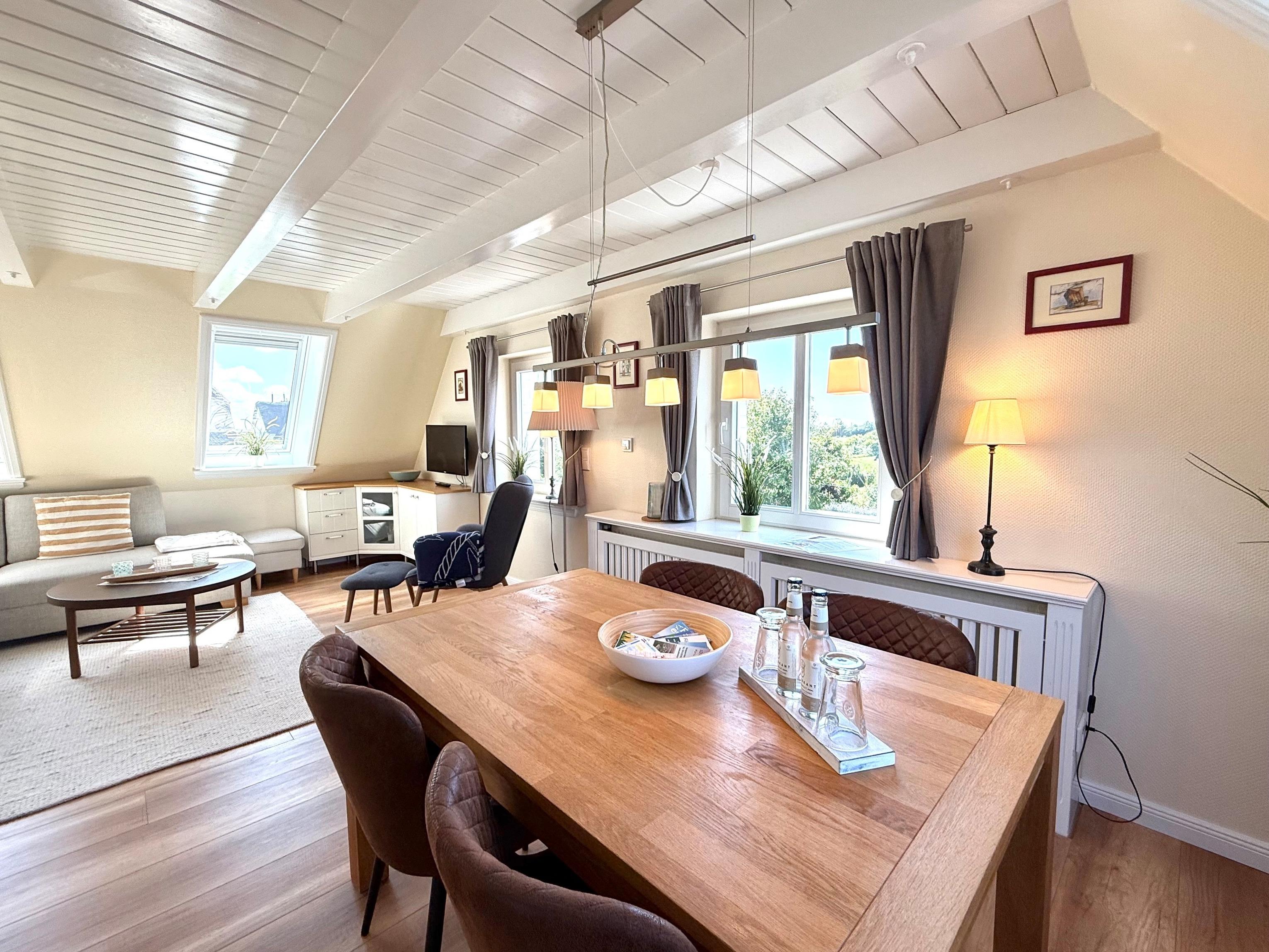 3 - Zimmer-Wohnung im Deichhof Dunsum, Whg.26, Infos unter www.deichhof-föhr.de. Diese attraktive Dachgeschoss-Wohnung (ca. 55 m²) für 2 Personen in einem Einzelhaus mit 5 Wohneinheiten im Deichhof besticht durch Ruhe und Gemütlichkeit auf hohem Wohnniveau. Die geschmackvoll und liebevoll eingerichtete Wohnung wurde Ende 2018 grundlegend renoviert und modernisiert. Sie besteht aus einem lichtdurchfluteten Wohnraum mit Essbereich, einem Schlafzimmer, einem Duschbad mit Badewanne und einer offenen Küchenzeile in dem sich Tradition mit zeitgemäßem Komfort verbinden. Die Küche ist ausgestattet mit hochwertigen Markengeräten.