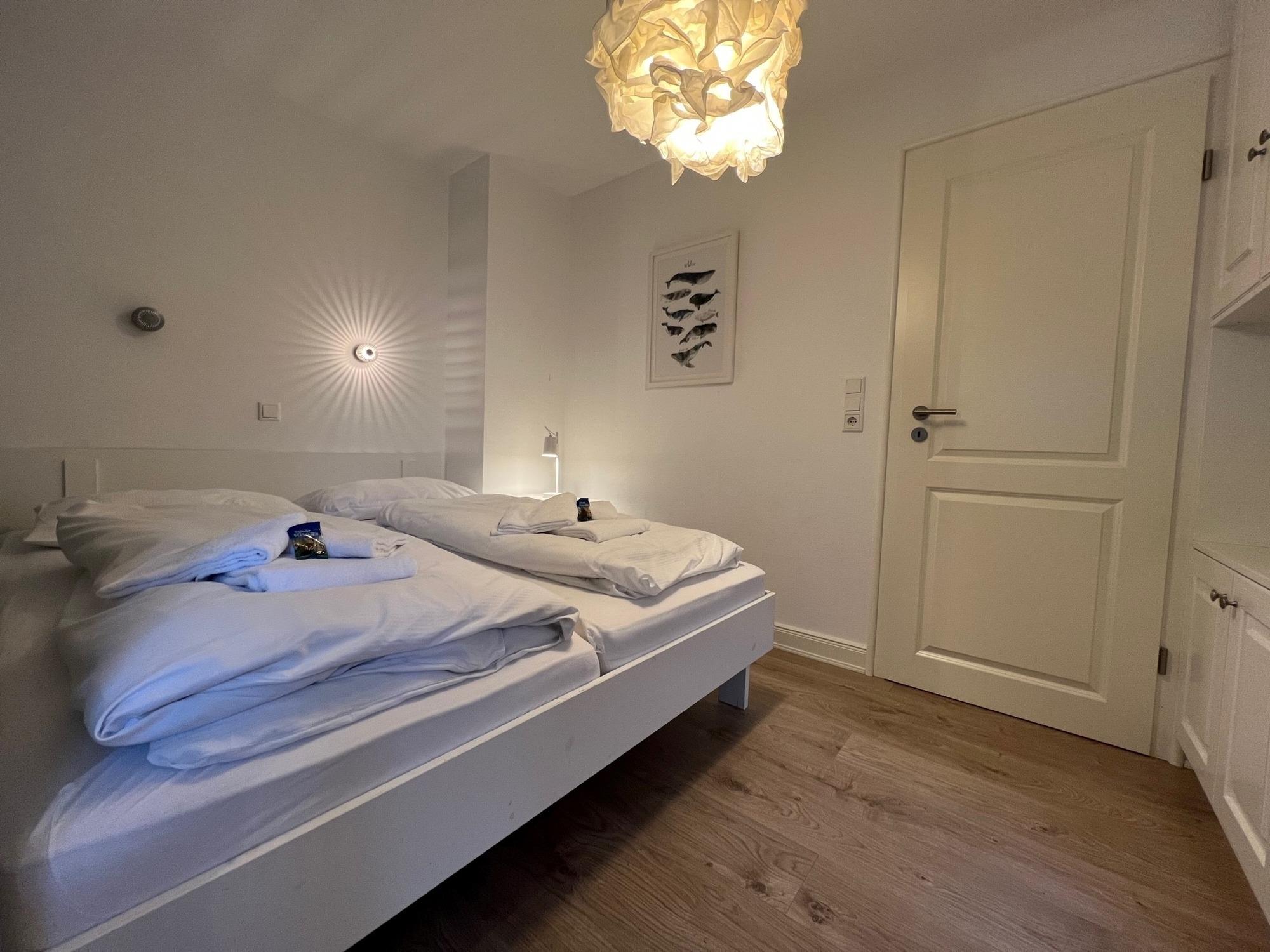 Unsere modern und wertig eingerichtete Ferienwohnung verfügt über zwei schöne Schlafzimmer, ein großes Wohnzimmer mit Wohnküche und ein geräumiges Badezimmer sowie ein zusätzliches Dusch-WC. In beiden Schlafzimmern befindet sich ein Doppelbett. So haben in der Wohnung maximal vier Personen Platz. Die helle und freundliche Atmosphäre in den Räumen lädt zum Essen, Trinken und Verweilen ein. Die Wohnung befindet sich "barrierearm" im Erdgeschoss und verfügt über einen eingezäunten Garten an der Südseite des Hauses, der gerne von Ihnen genutzt werden darf. Im Garten befindet sich eine gemütliche, moderne Sitzgelegenheit zum Frühstücken und gemeinsamen Essen sowie zwei Sonnenliegen. Im Strandkorb können Sie die wunderschönen Sonnenuntergänge genießen oder auf der Bank vor dem Haus nachts die Sternschnuppen zählen.
