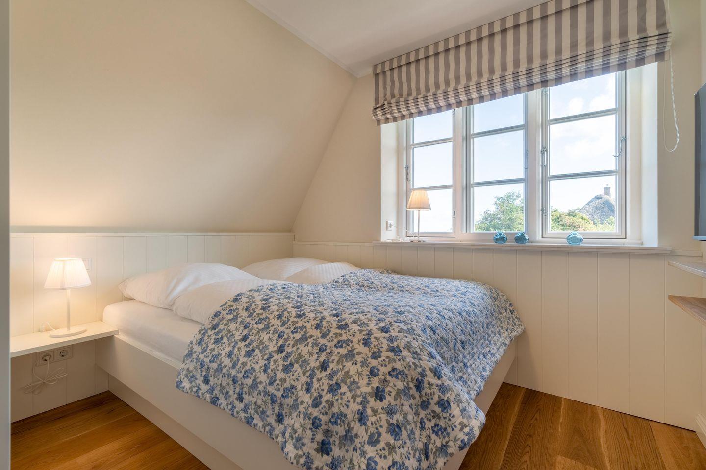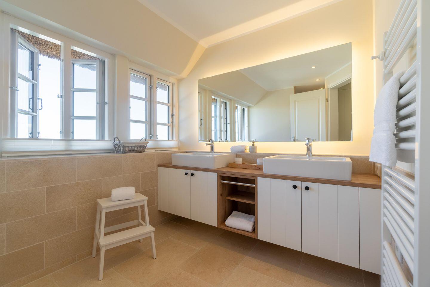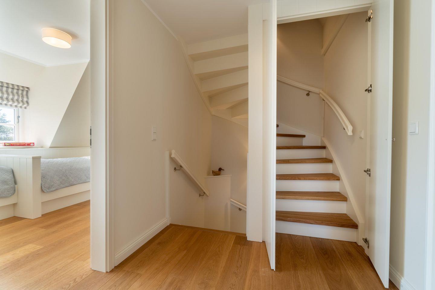 Im Obergeschoss befinden sich die drei Schlafzimmer sowie ein weiteres Duschbad. Zwei der Schlafzimmer verfügen über je ein Doppelbett, das dritte verfügt über zwei Einzelbetten. In einem Schlafzimmer befindet sich ein Arbeitsplatz. Das Duschbad ist sehr großzügig gehalten und bietet Ihnen einen schönen Ausblick auf die umliegende Landschaft.