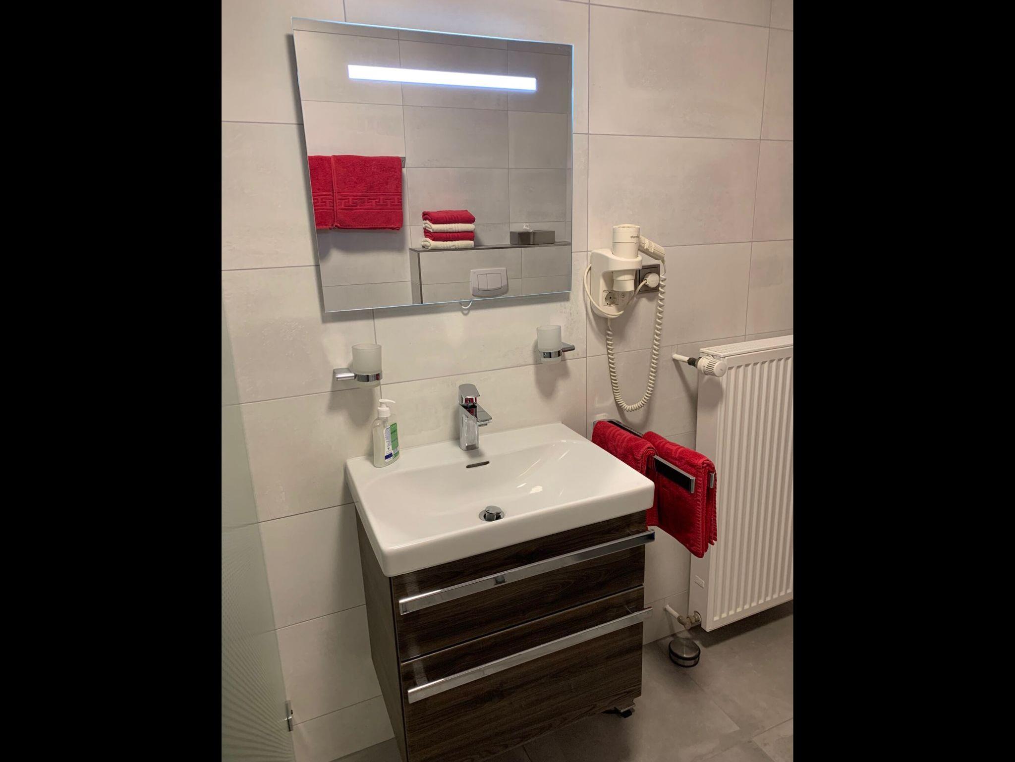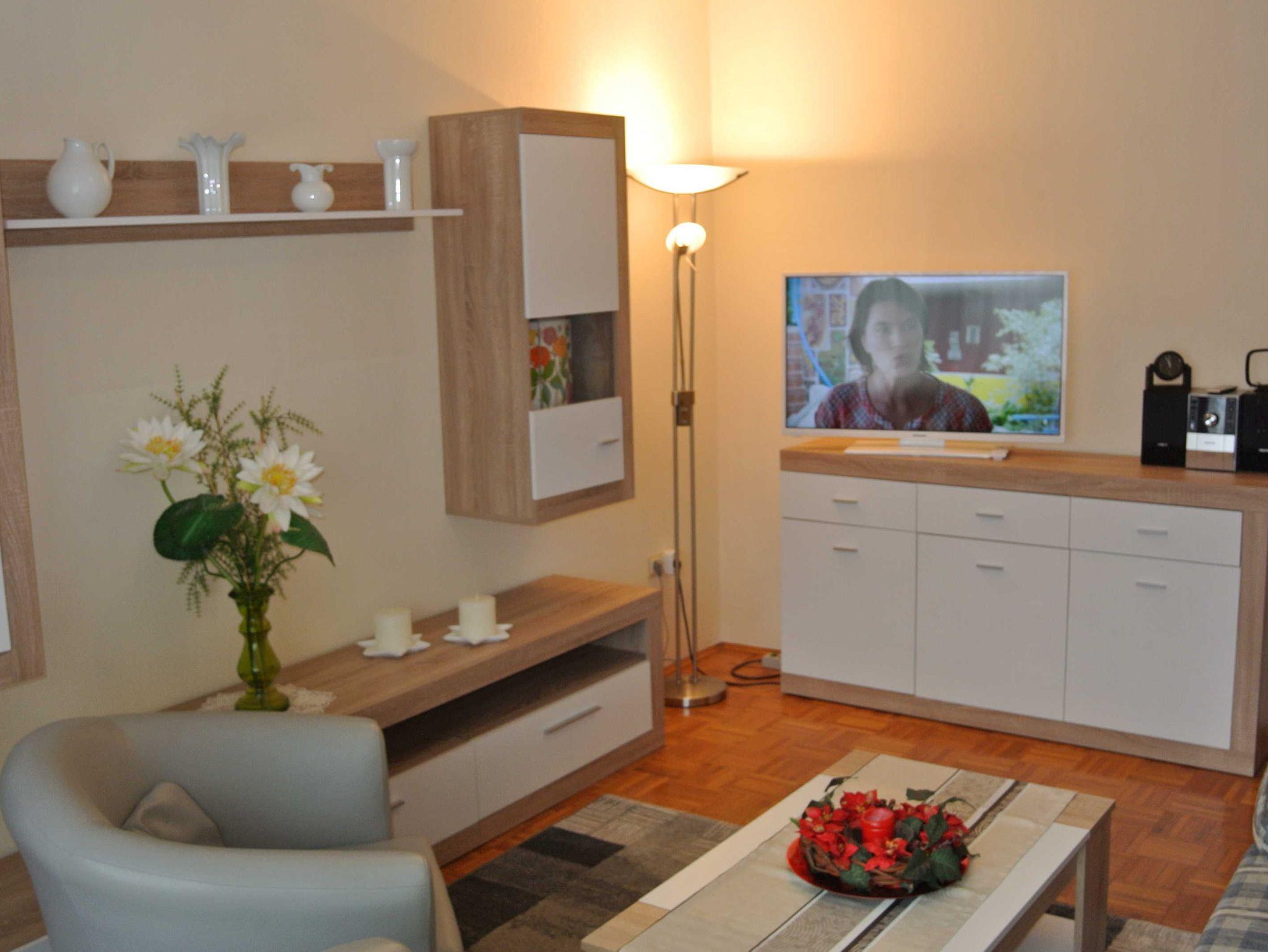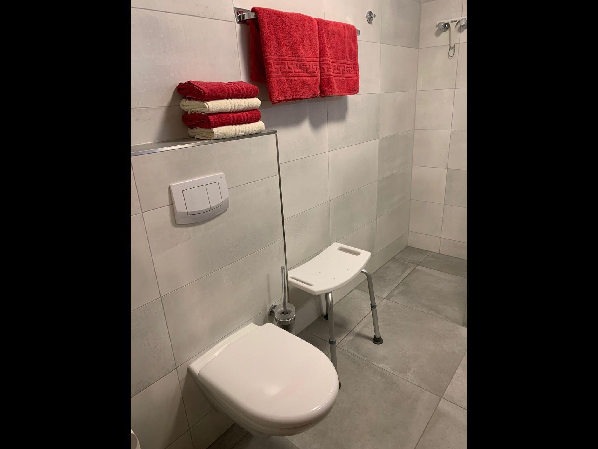 Im Schlafzimmer befindet sich ein Doppelbett und im Wohnzimmer eine Schlafcouch (2x1,60 m). Das neue Badezimmer verfügt über eine begehbare Dusche und WC, auch ein Föhn ist vorhanden. Ein zusätzlich separates WC bietet eine weitere Waschgelegenheit.