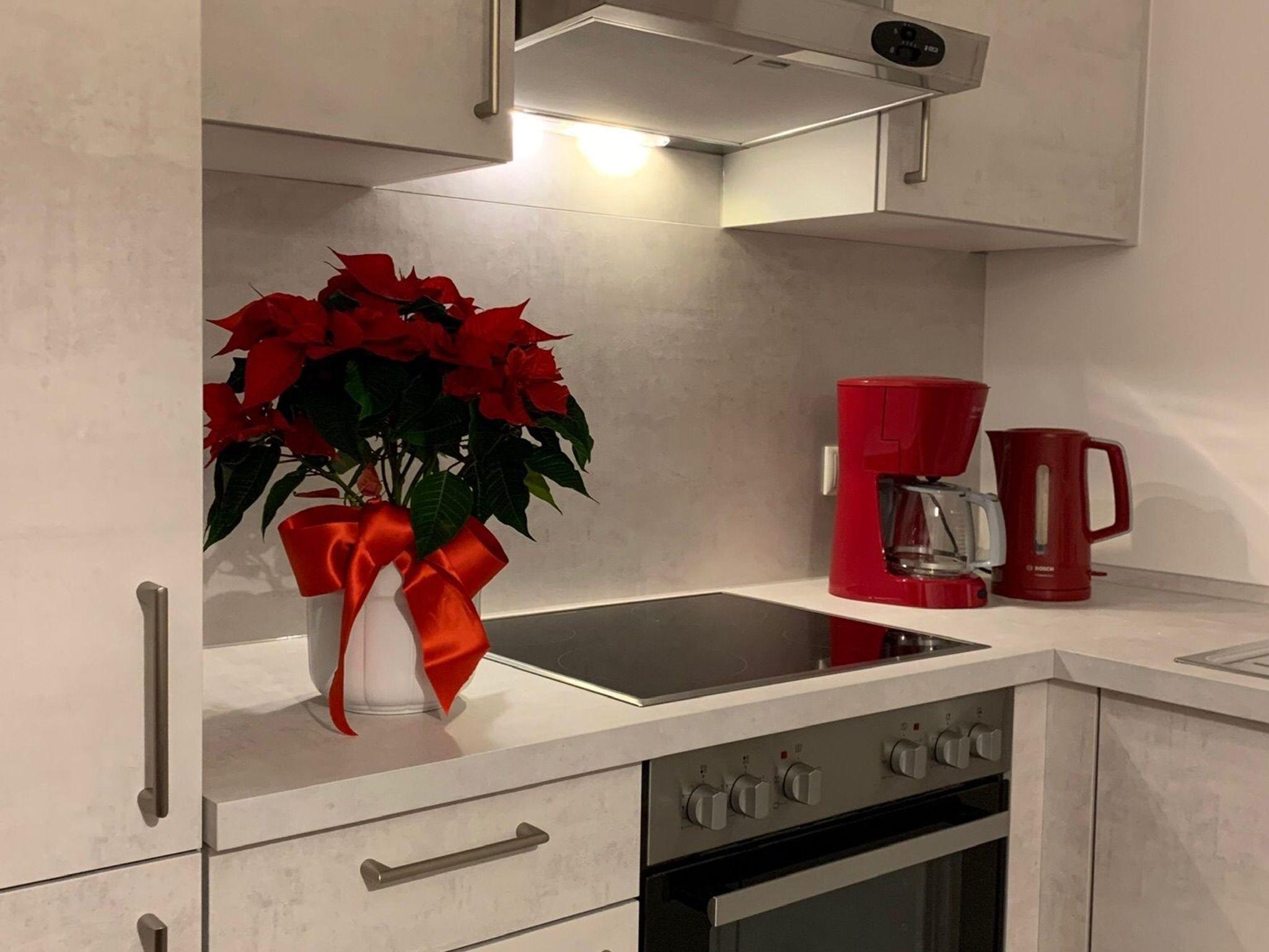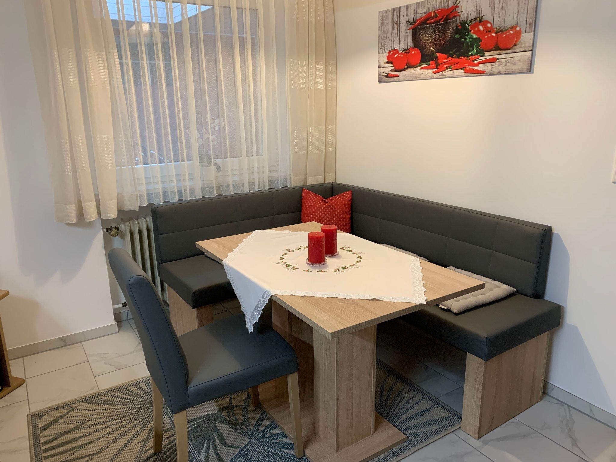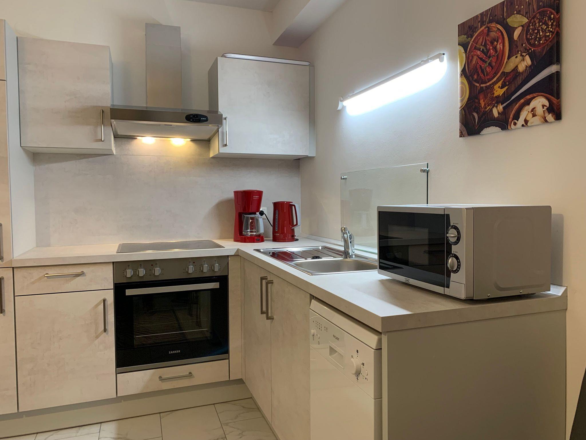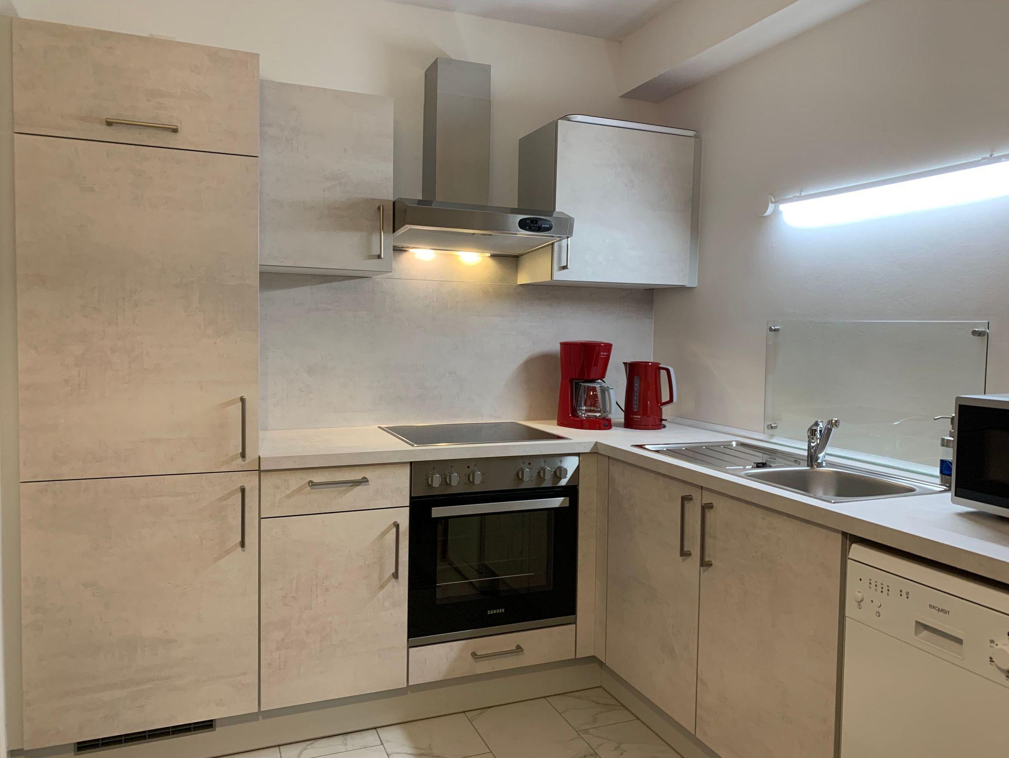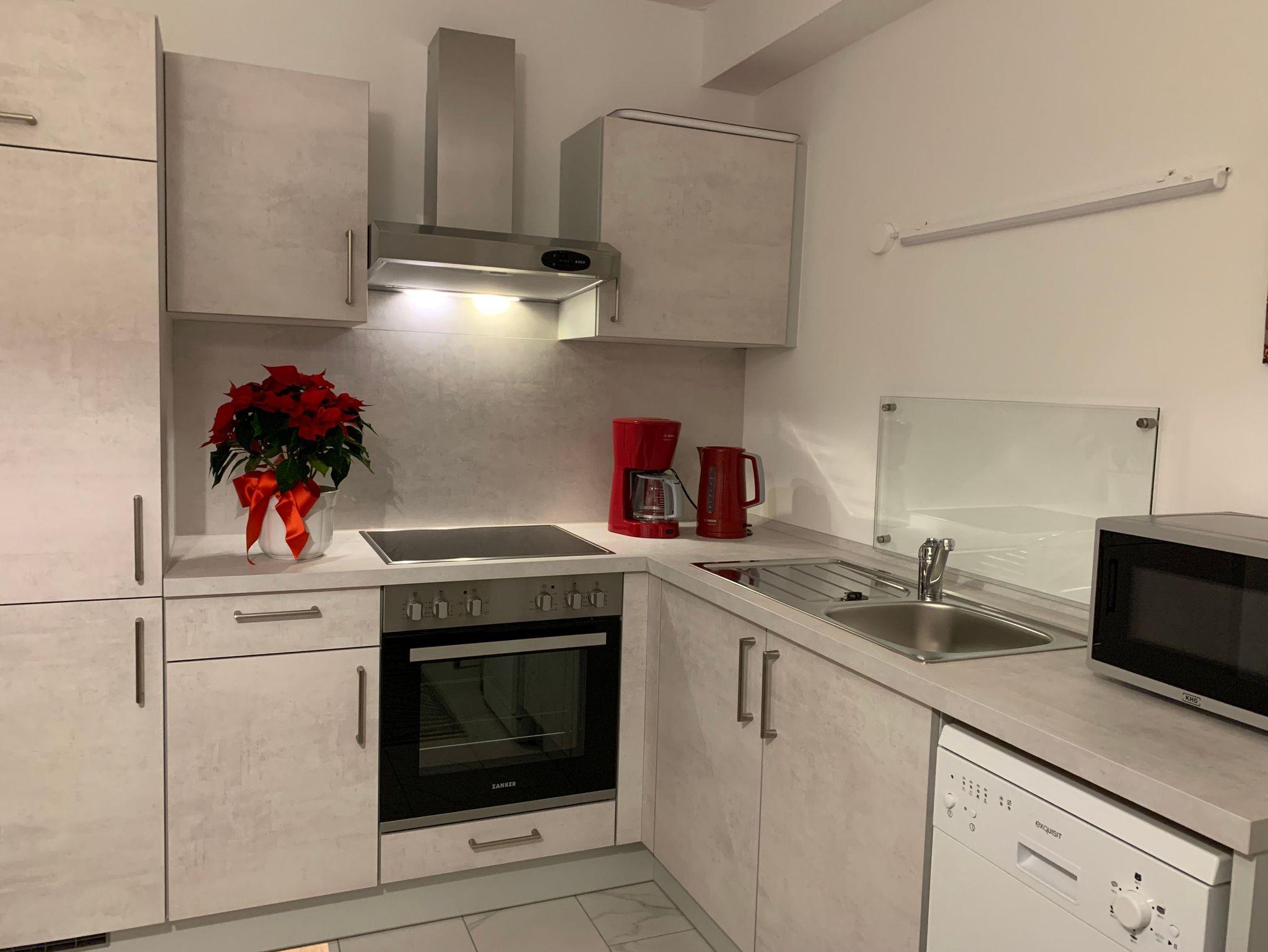 Die Wohnung ist ca. 60 qm groß. Sie verfügt über einen eigenen Eingang mit Windfang und ist ausgestattet mit einer komplett eingerichteten modernen Wohnküche einschließlich moderner elektrischer Küchengeräte, Mikrowelle und Geschirrspülmaschine sowie einer gemütlichen Sitzecke.
