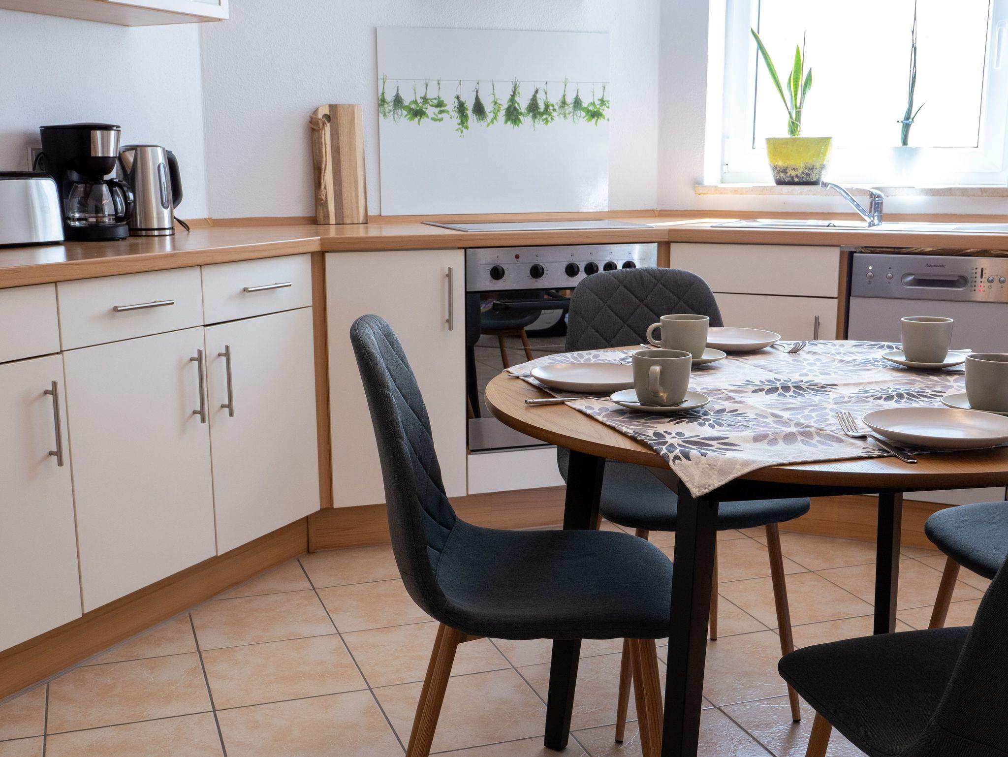 Die Ferienwohnung ist 56qm groß und verfügt über einen Wohn/Essbereich mit optionaler Schlafcouch und einer vollausgestatteten Küche mit Spülmaschine.