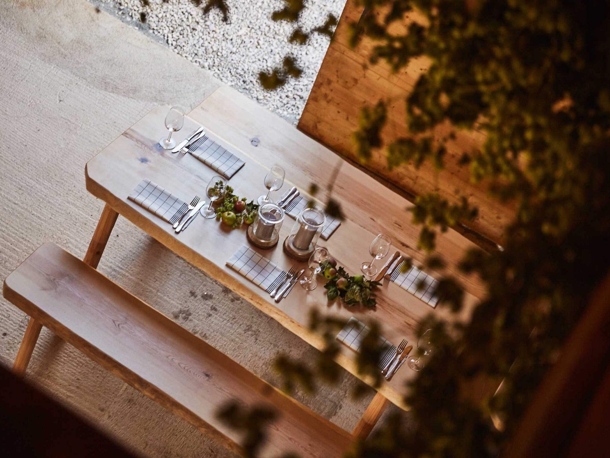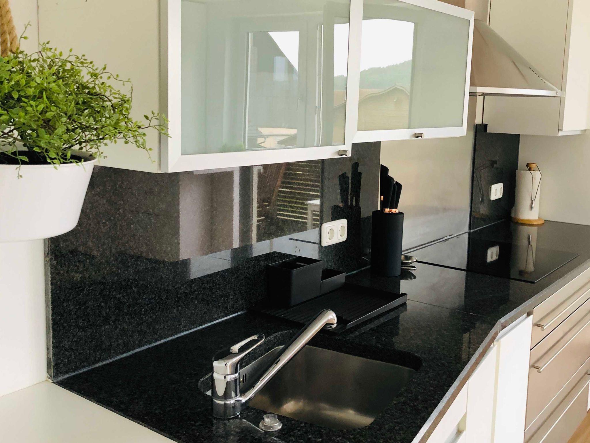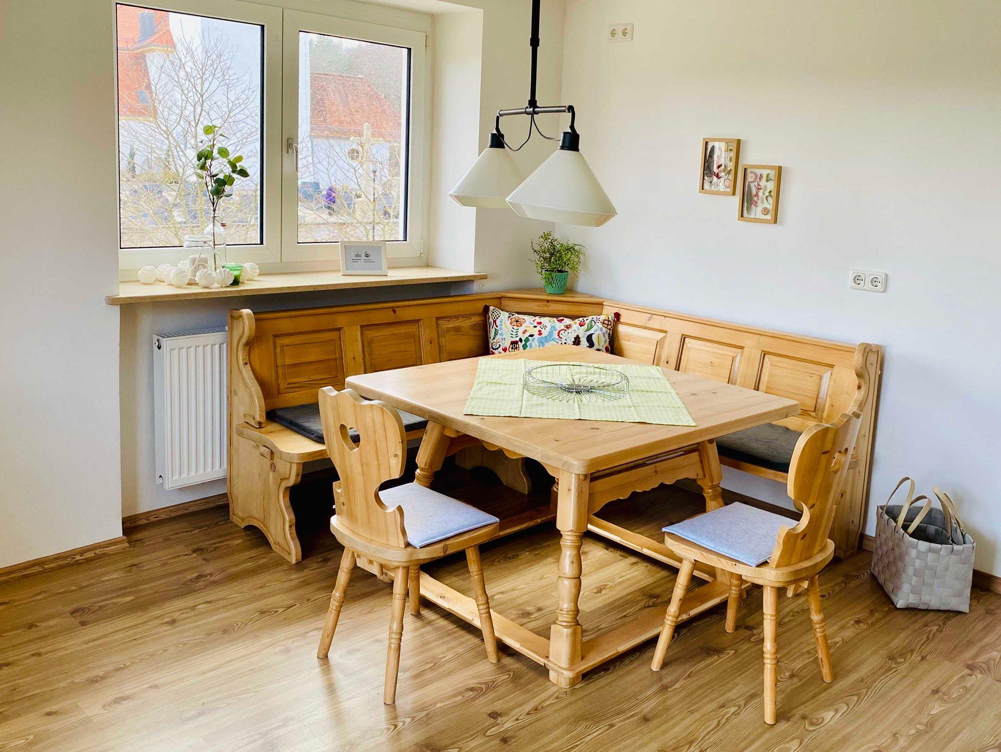 - eine große Wohnküche mit Elektroherd, Kochplatte, Dampfgarer, Mikrowelle, Kühlschrank, Eierkocher, Toaster und Geschirrspüler, Geschirr für 6 Persone, einen großen Esstisch für bis 8 Person, genügend Gläser und Küchenutensilien zum gemeinsamen Kochen und einen Balkon mit einem wunderschönen Blick auf den Hof und den sogenannten Kaberg.