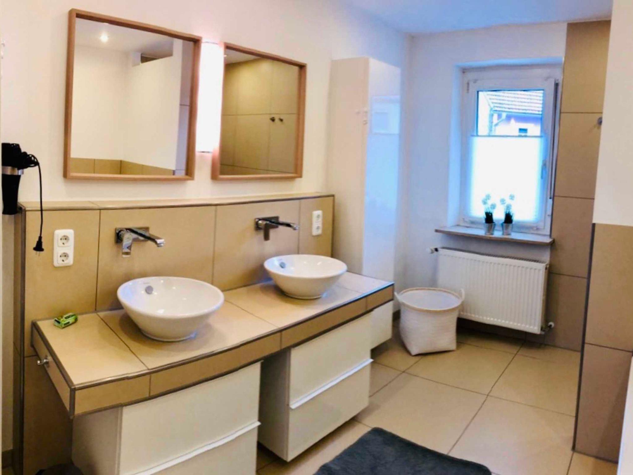 - Das Badezimmer ist neu hat eine ebenerdige geräumige Dusche mit Kopfbrause, zwei beleuchtete Badspiegel, Föhn, Schminkspiegel, 4 Badschränke, WC und zwei Waschbecken