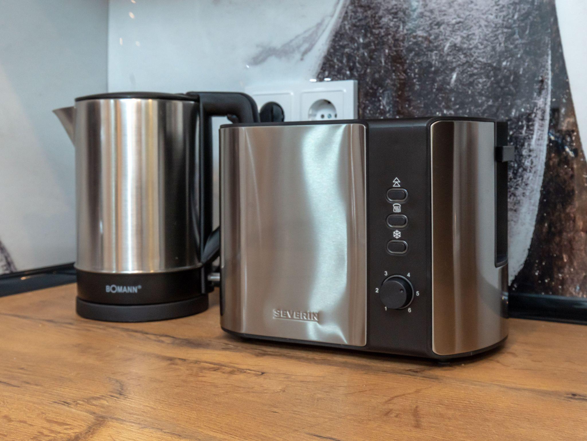 Teekanne mit Stövchen, Toaster, Wasserkocher und Kochutensilien.