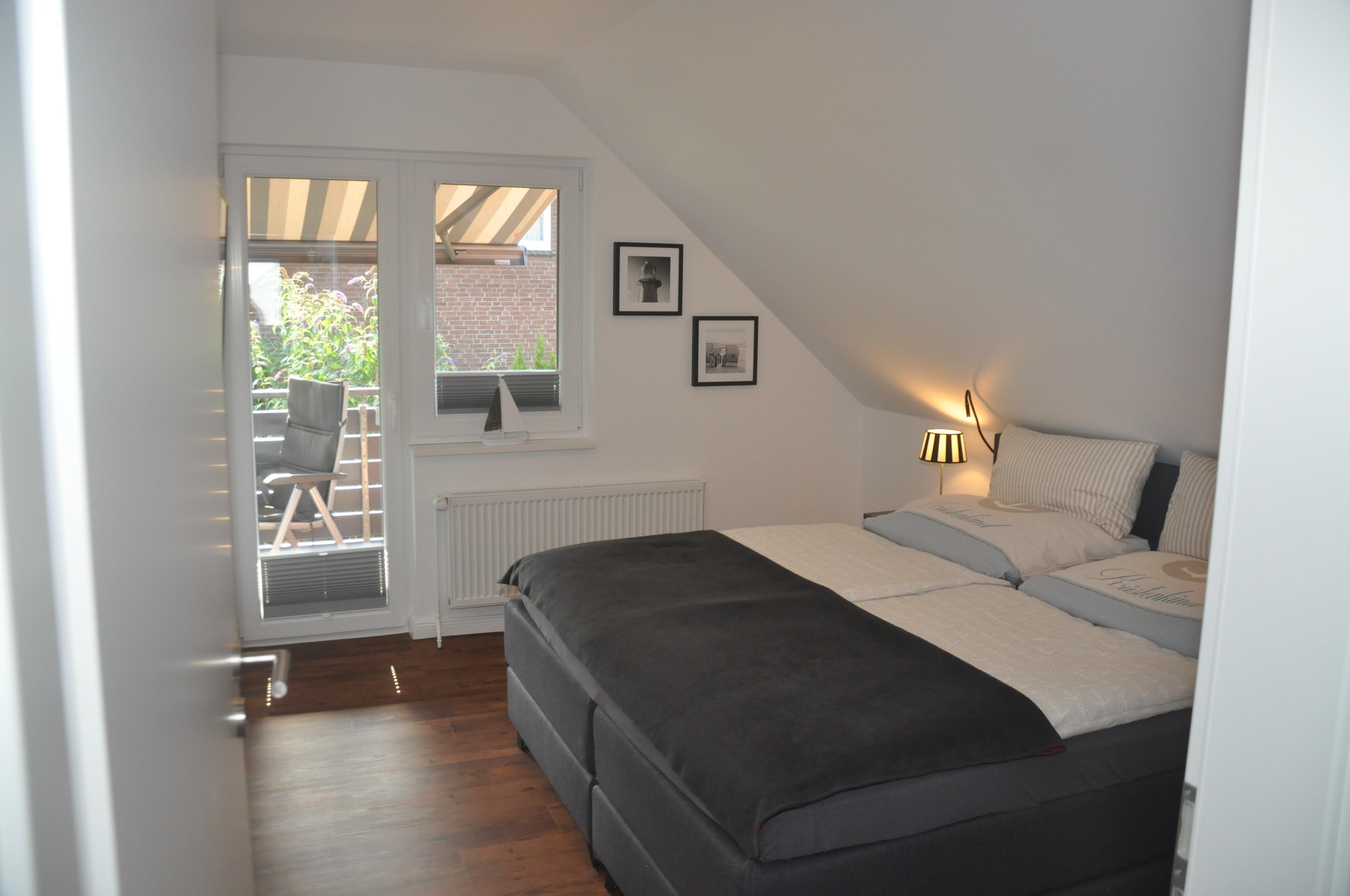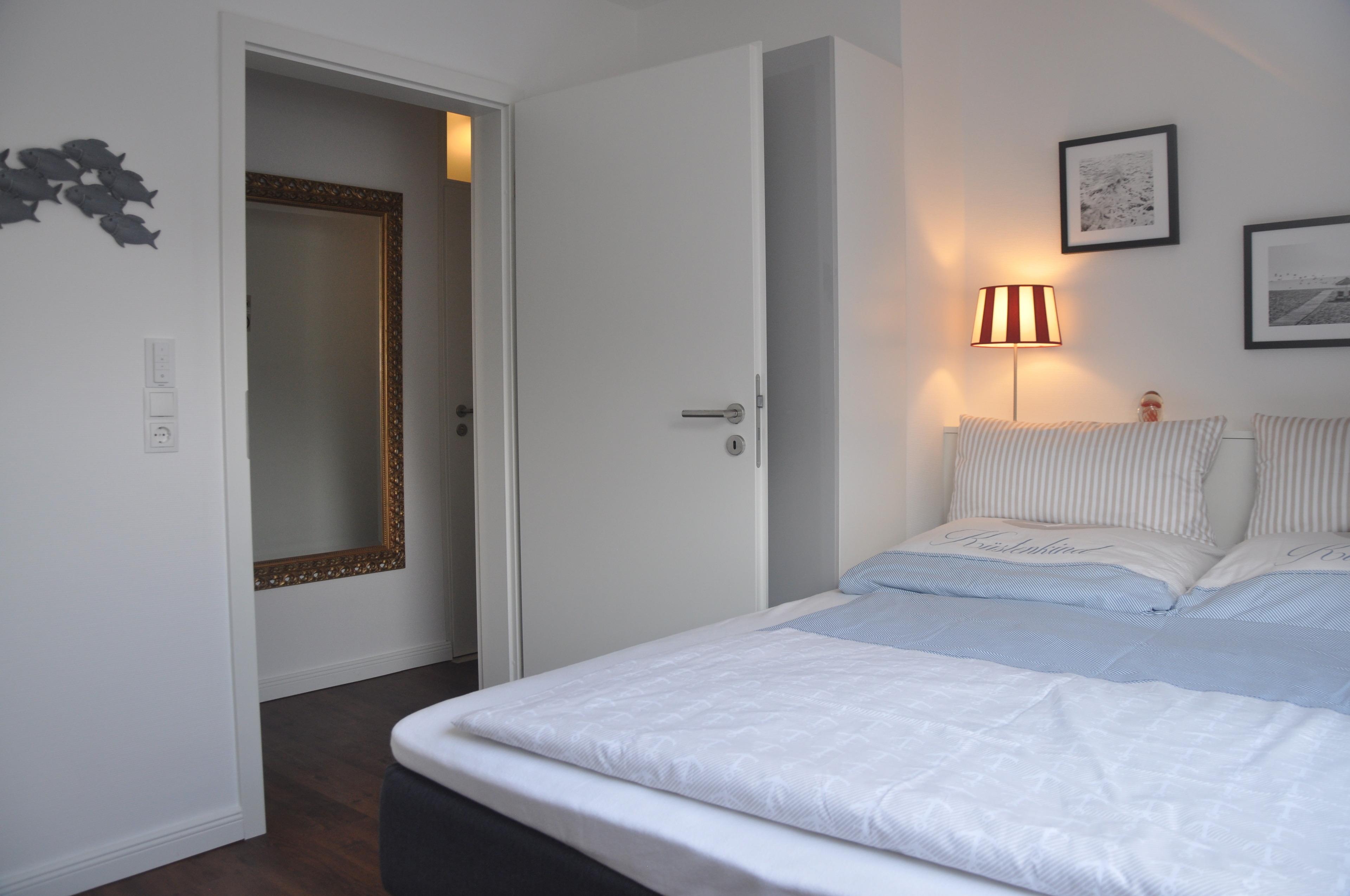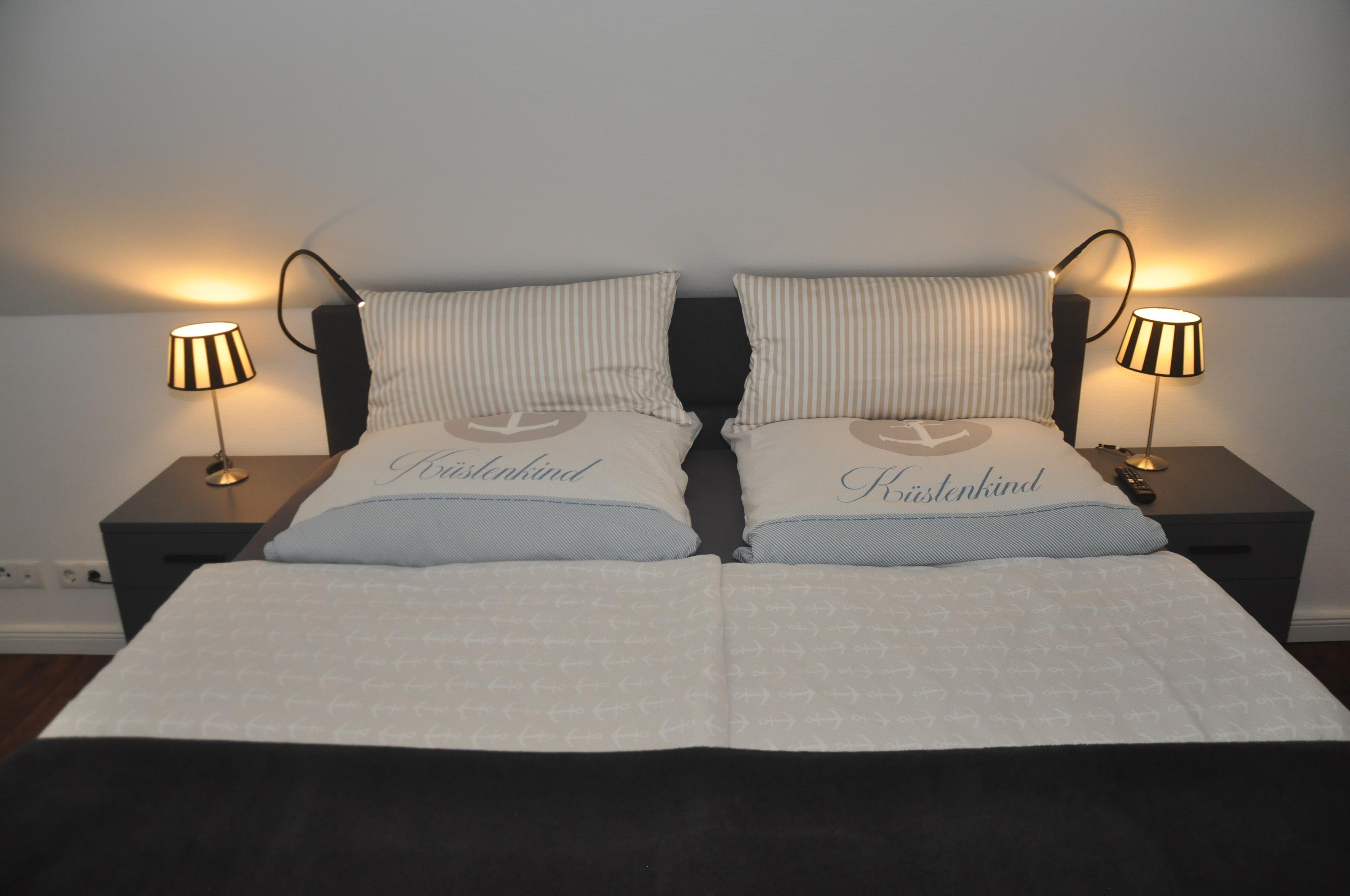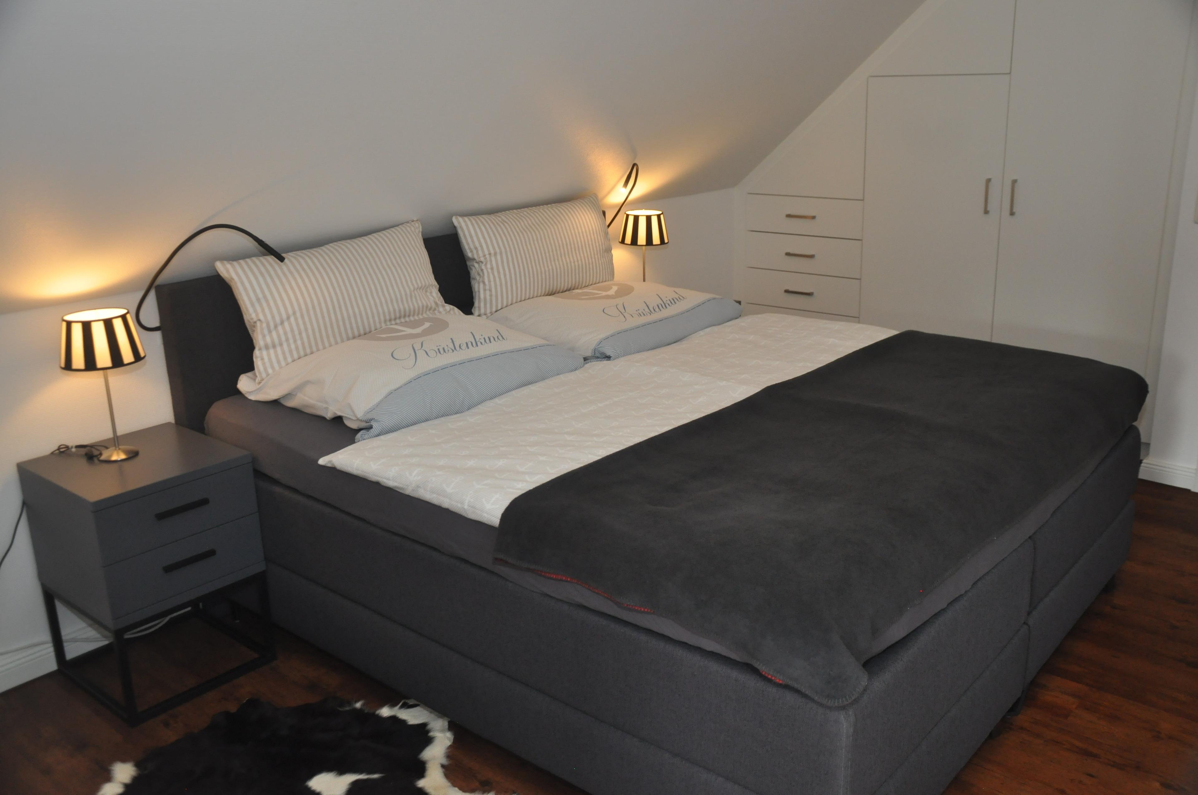 Innen erwarten Sie zwei separate Schlafzimmer, jeweils ausgestattet mit komfortablen Boxspring-Betten der Marke