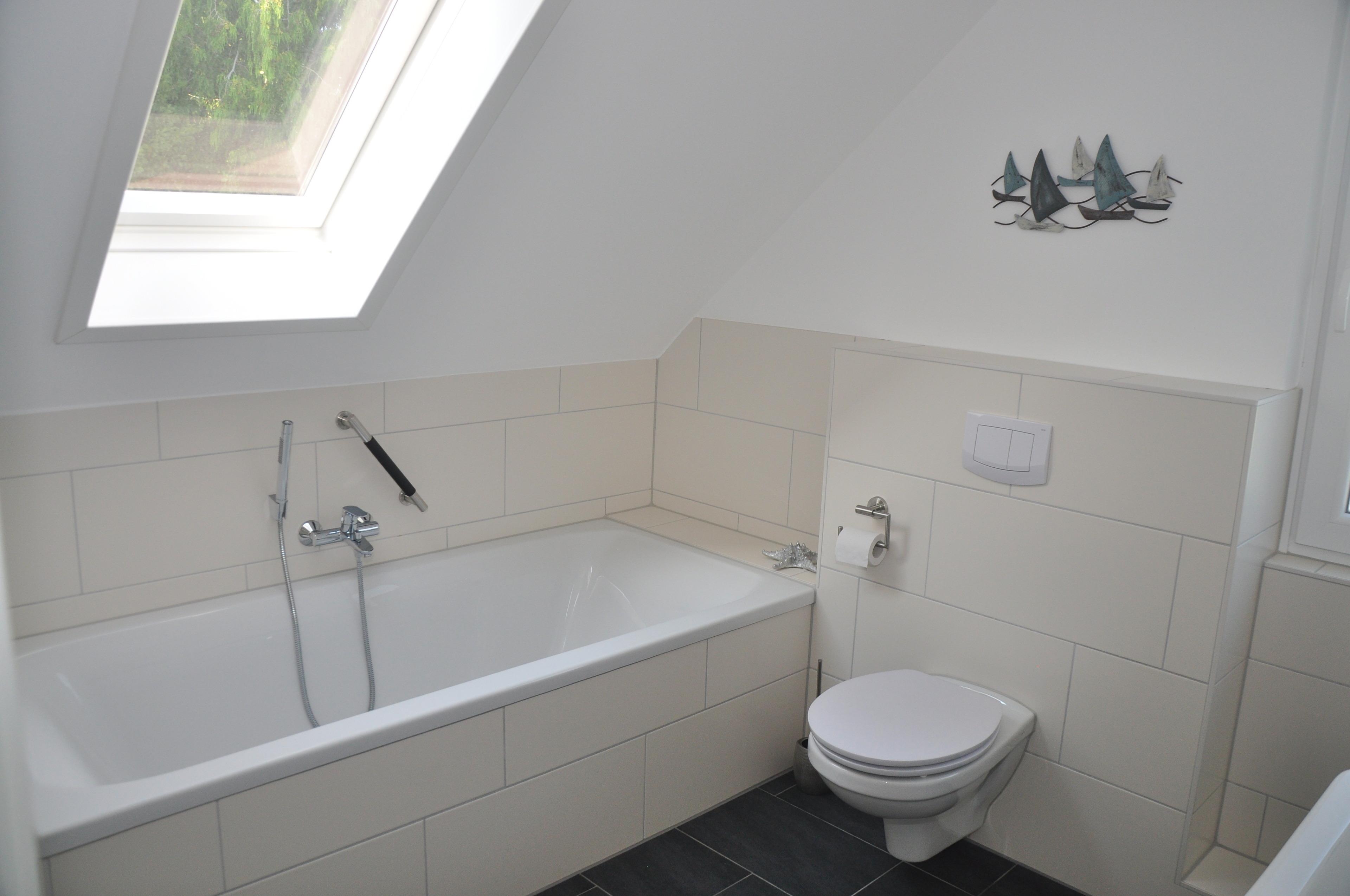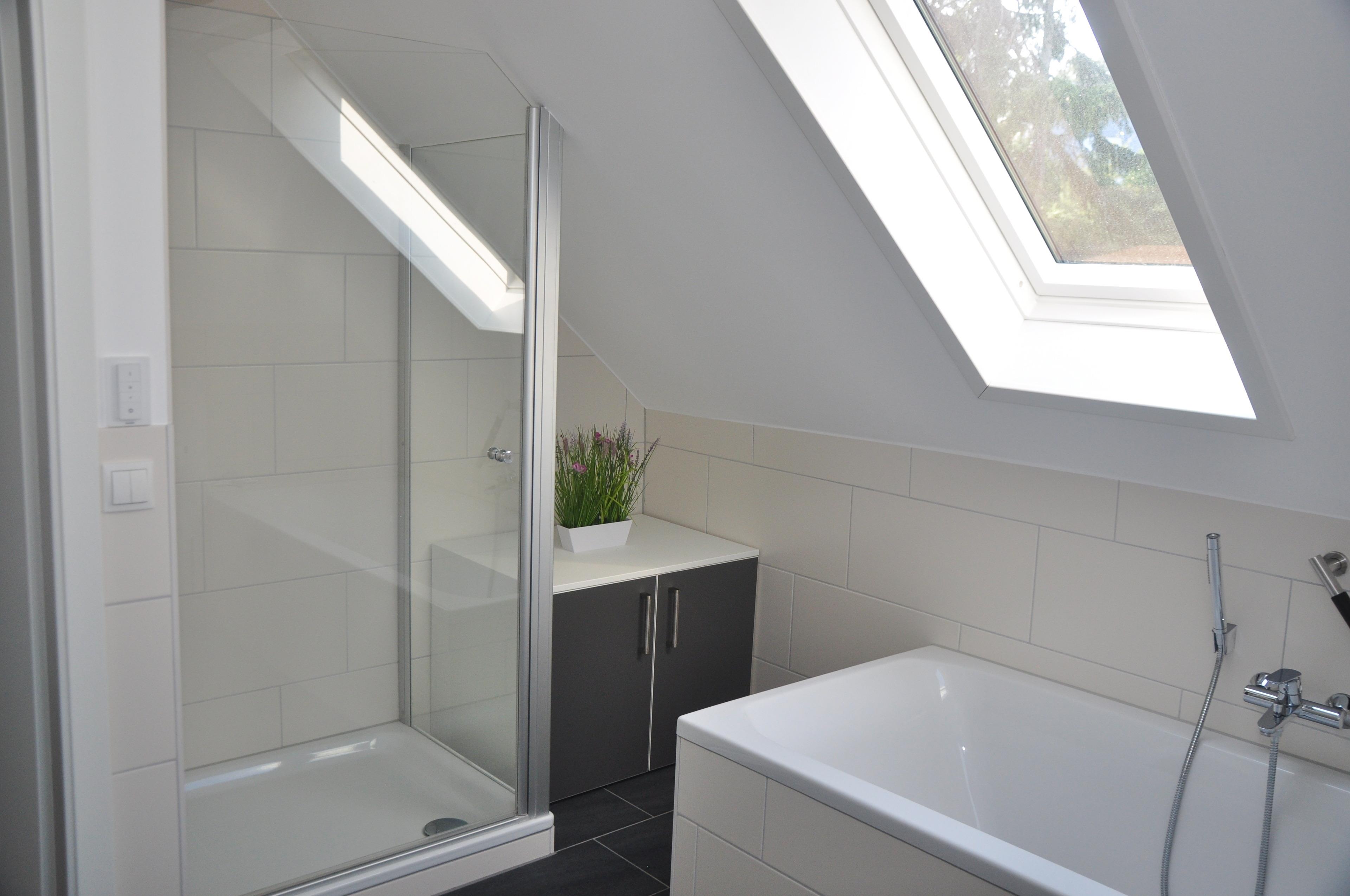 Ein großes Tageslichtbad mit Fußbodenheizung und Sprossenheizkörper, ausgestattet mit XL-Badewanne, großer separater Dusche, Doppelwaschbecken, Haarfön.