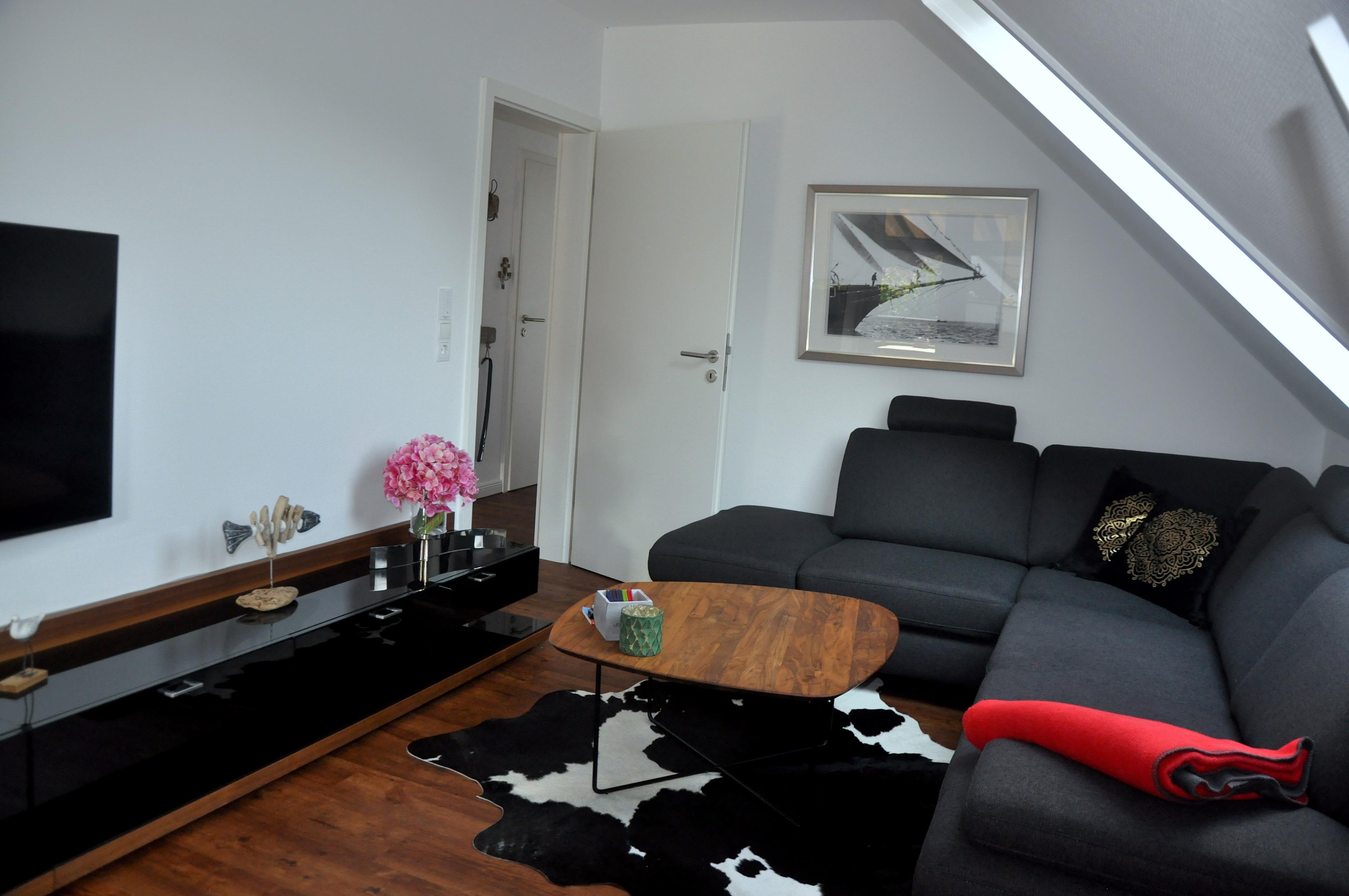 Ein helles gemütlich eigerichtetes Wohnzimmer mit großer Eckcouch (ausziehbar, mit Schlafmöglichkeit).