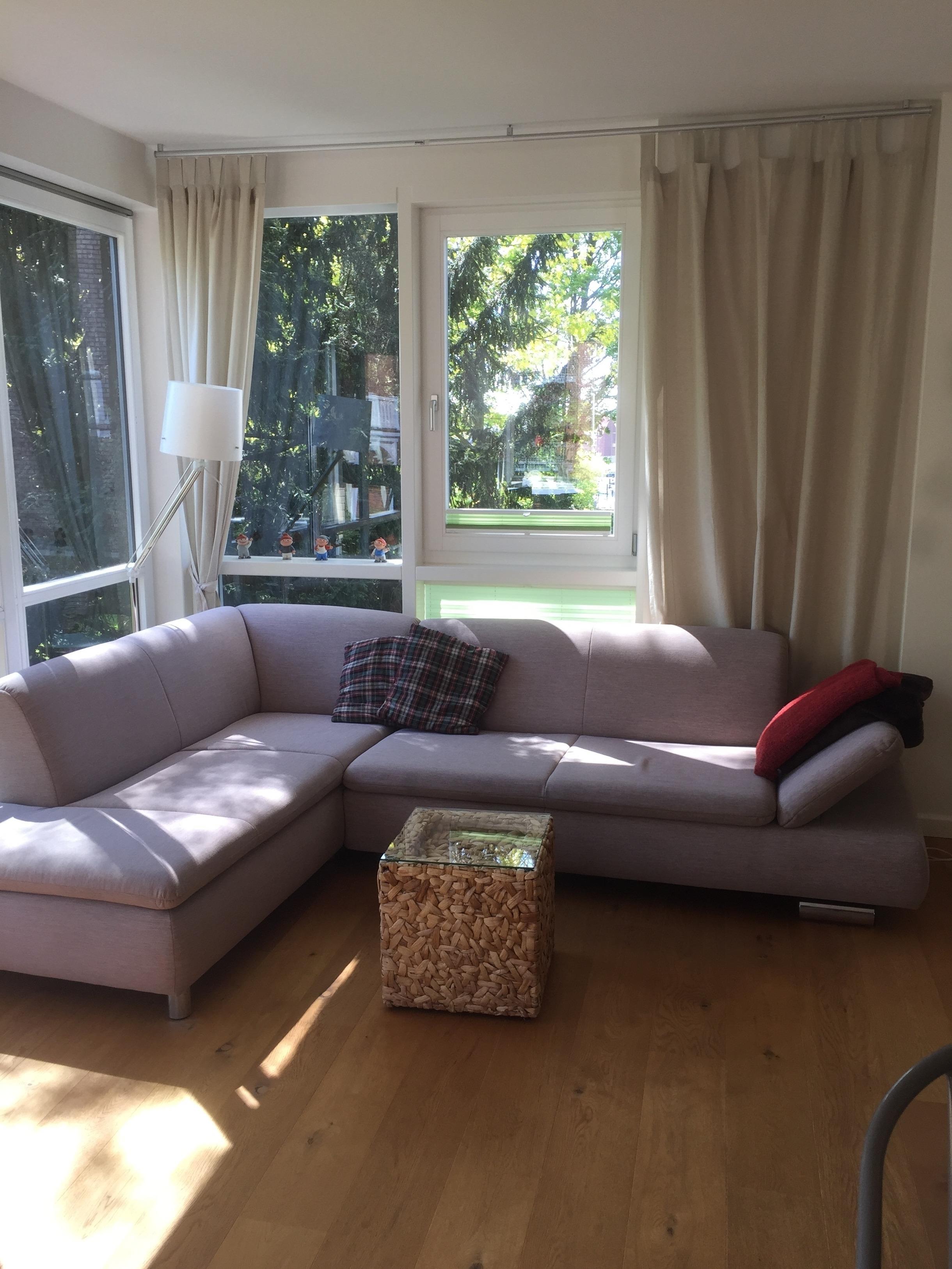 Wohnzimmer/Esszimmer: Eckcouch mit Blick in den Bürgerpark und ein IKEA-Poäng Sessel. Esstisch für 6 Personen, SAT-TV.